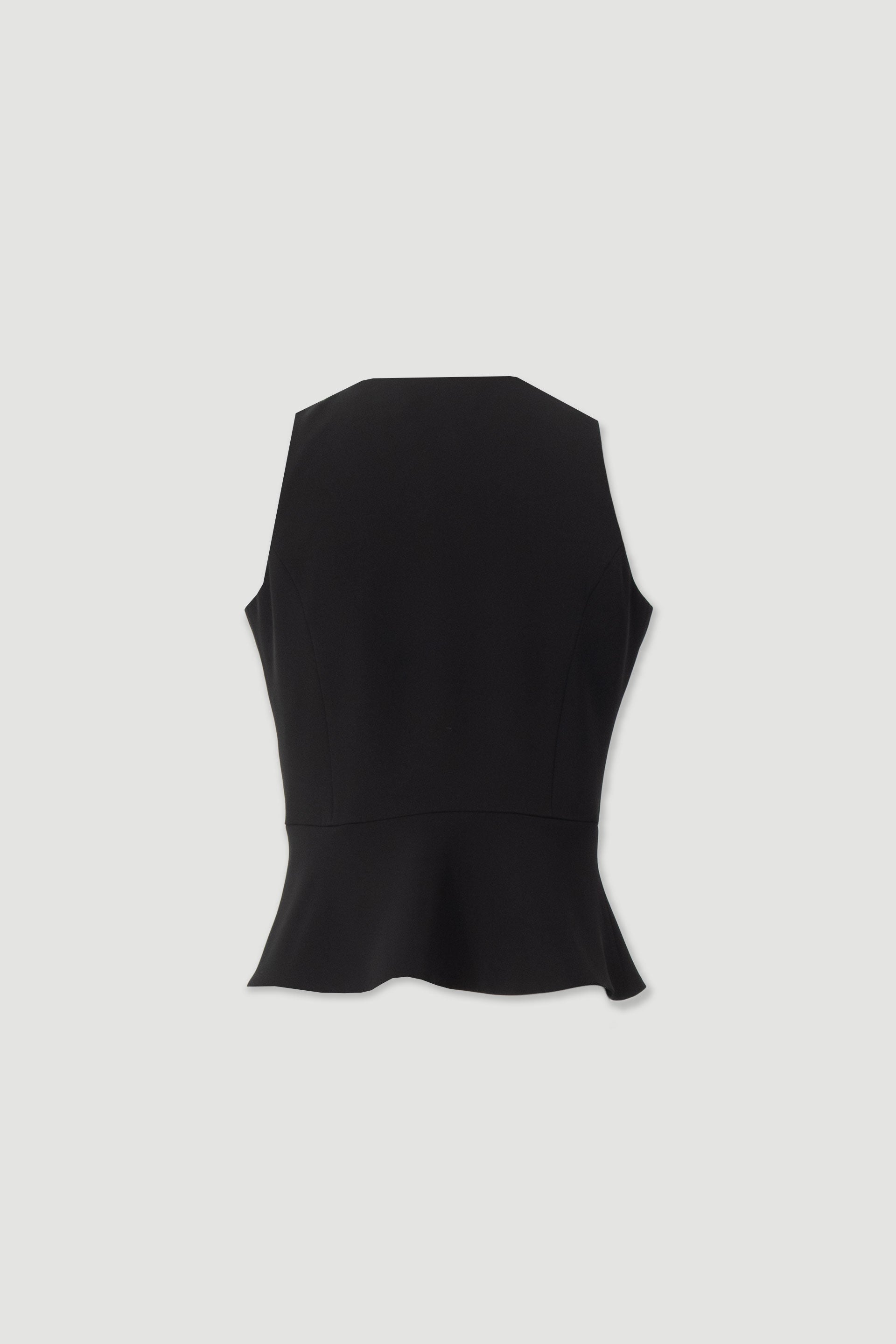 Colete estruturado sem mangas, com decote em V e fecho frontal por botões. Corte cintado com efeito peplum na bainha, que valoriza a silhueta com um toque elegante e feminino. Ideal para conjugar com calças de cintura subida ou saias, em looks sofisticados de dia ou de noite.