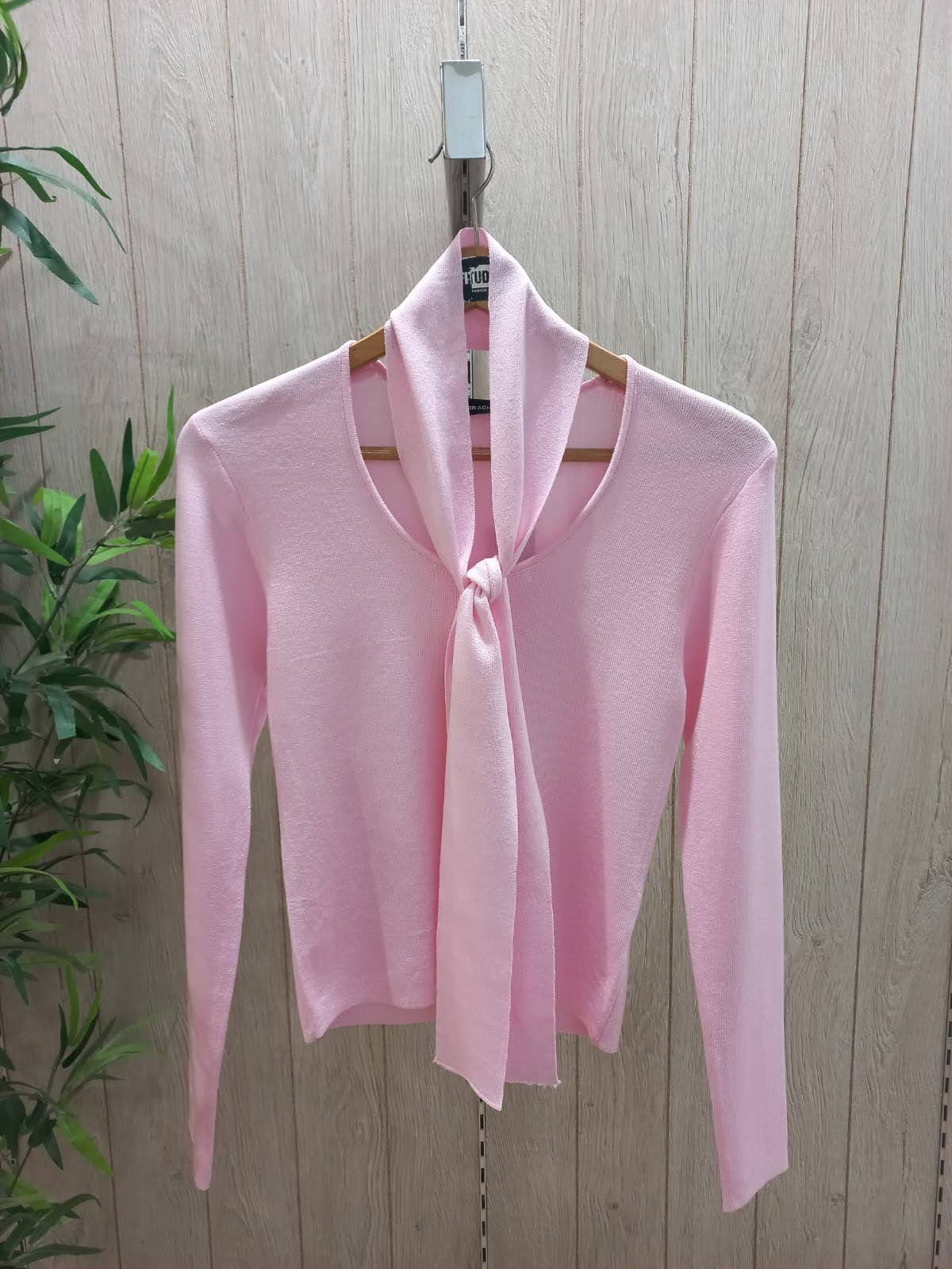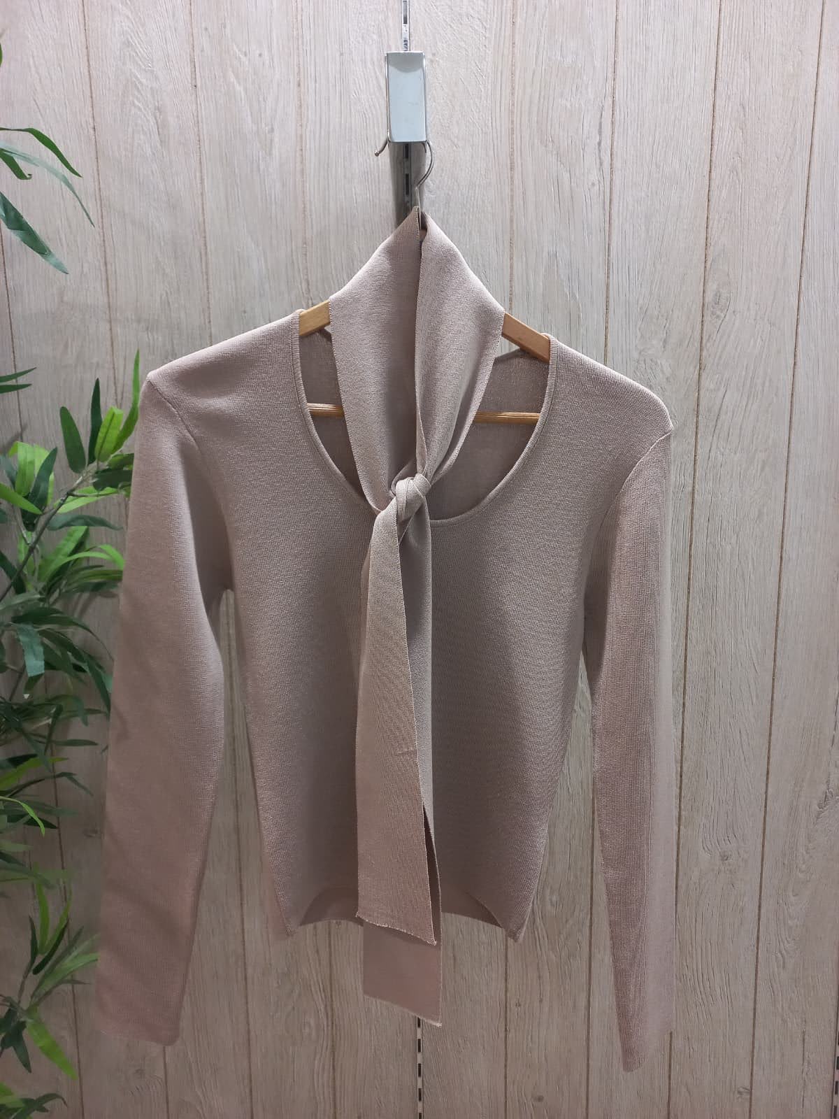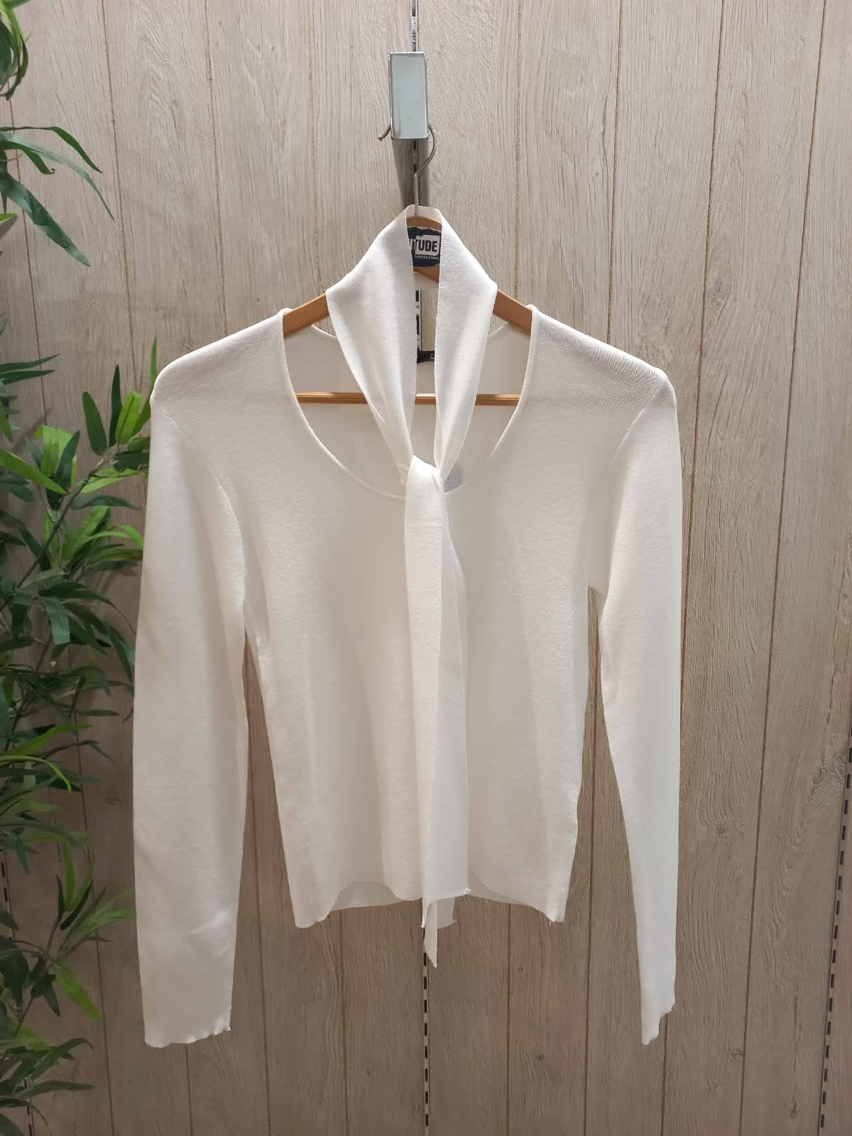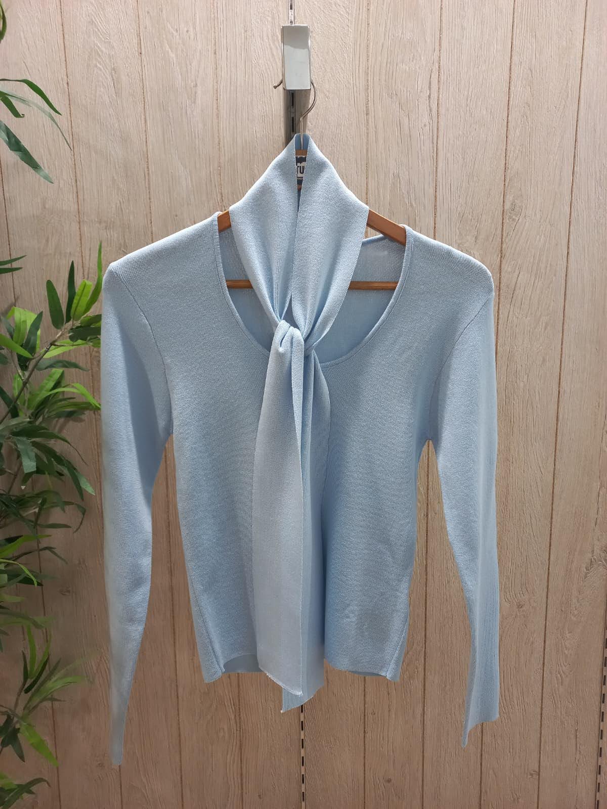 Camisola em malha de manga comprida. O destaque vai para o lenço no decote, que cria um efeito sofisticado e diferente, perfeito para dar um toque especial ao visual sem precisar de acessórios extra. Uma opção versátil para conjugar com calças de cintura subida, saias ou coordenados mais clássicos.