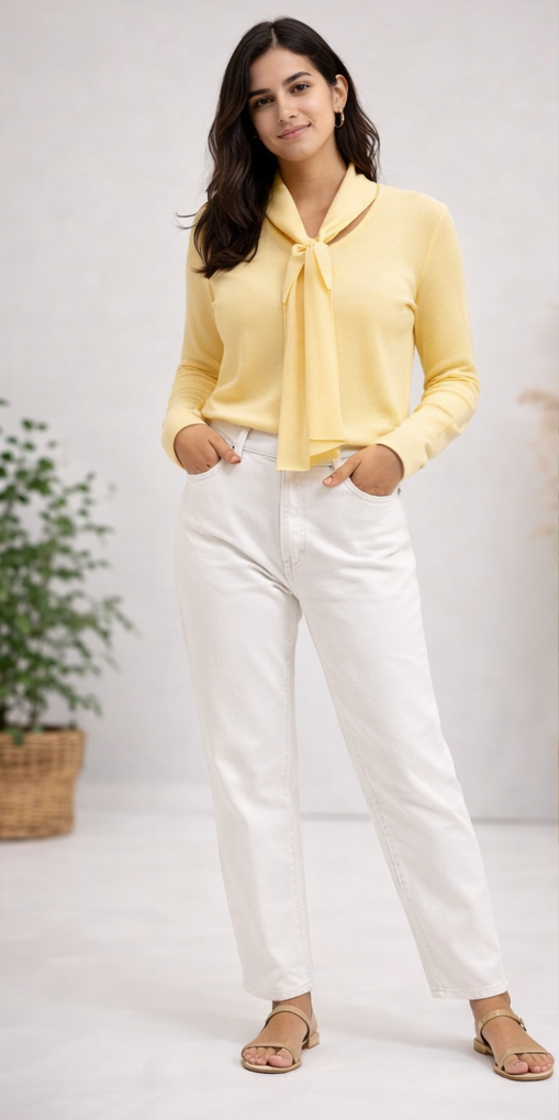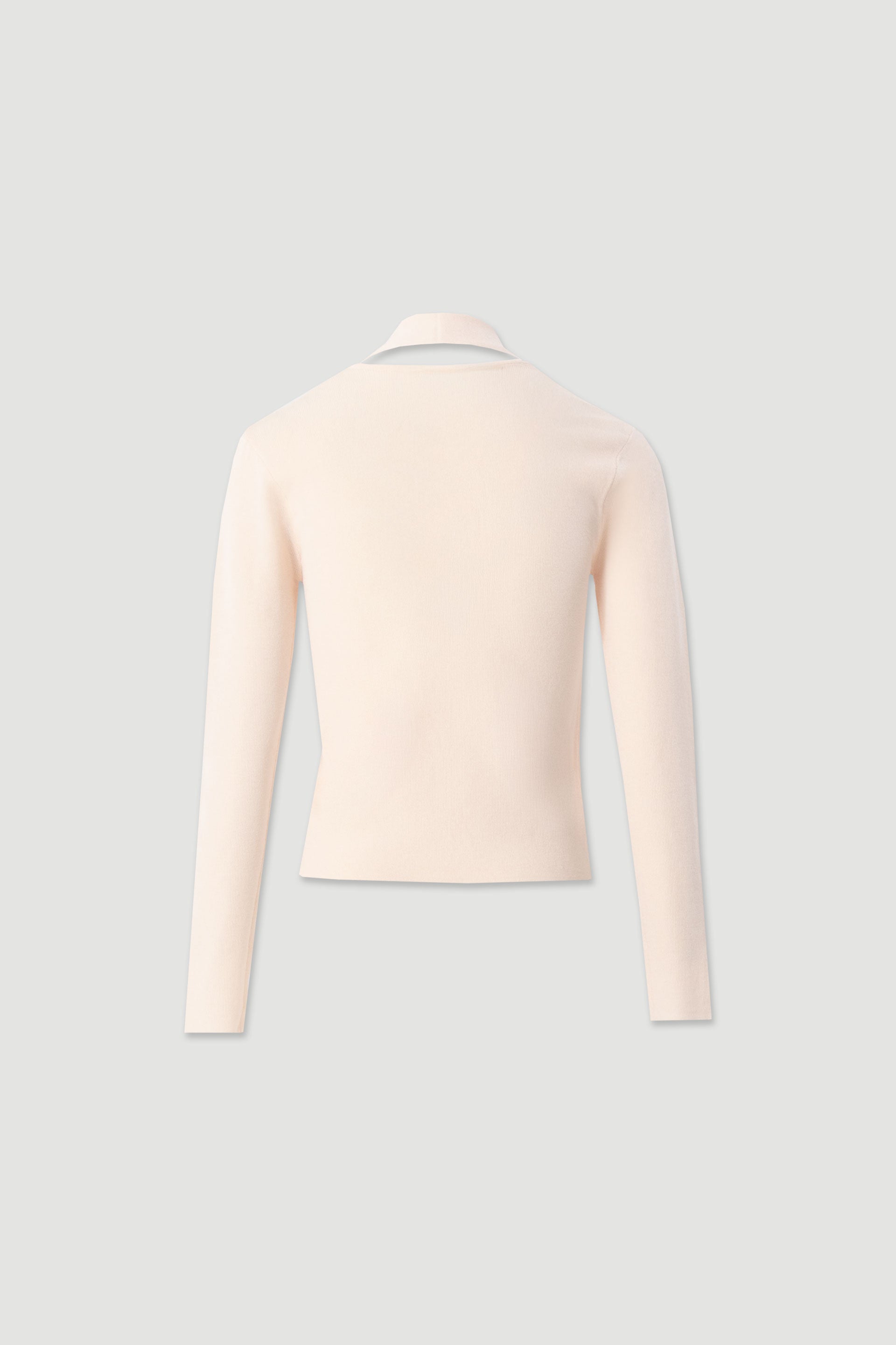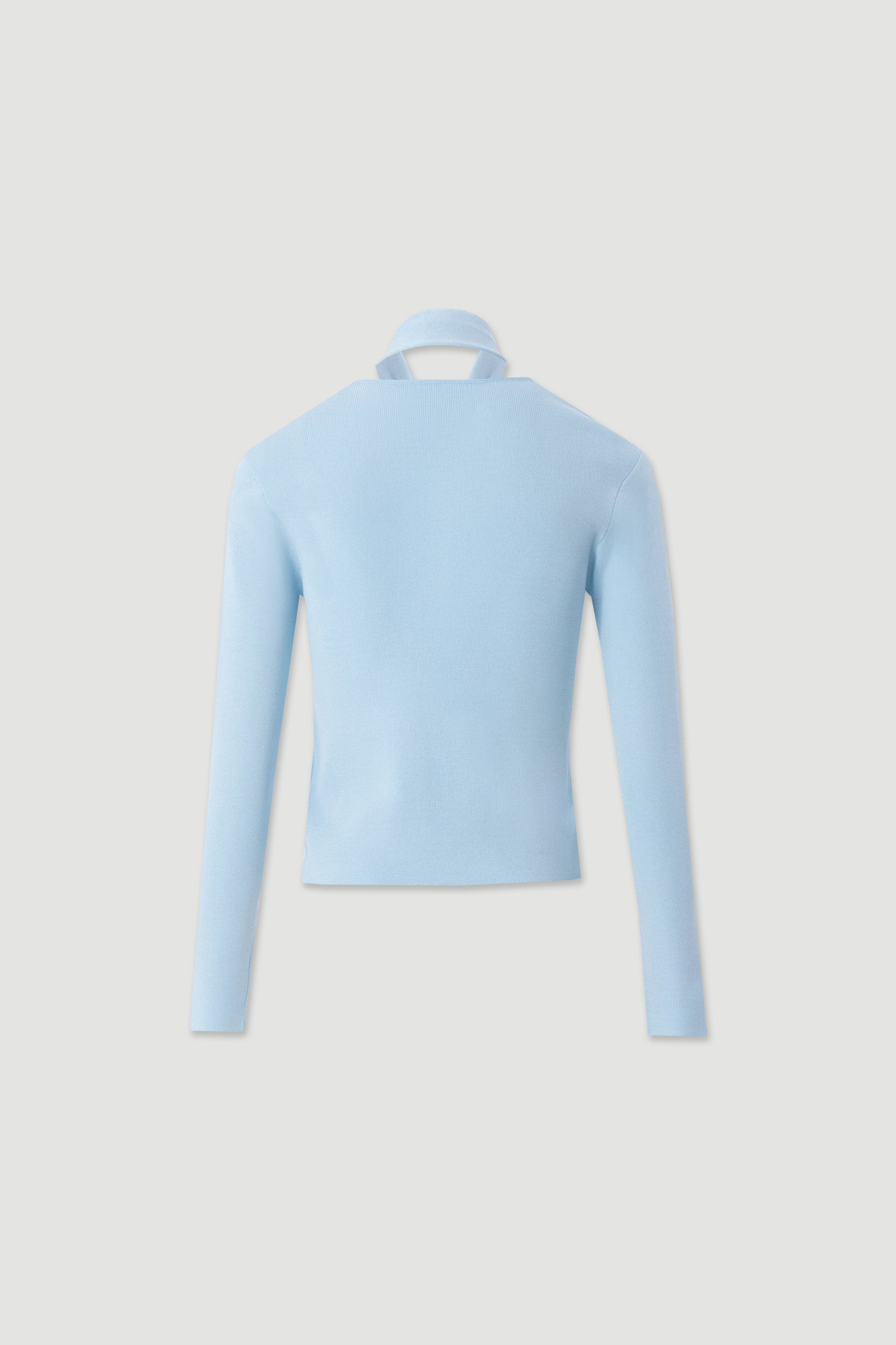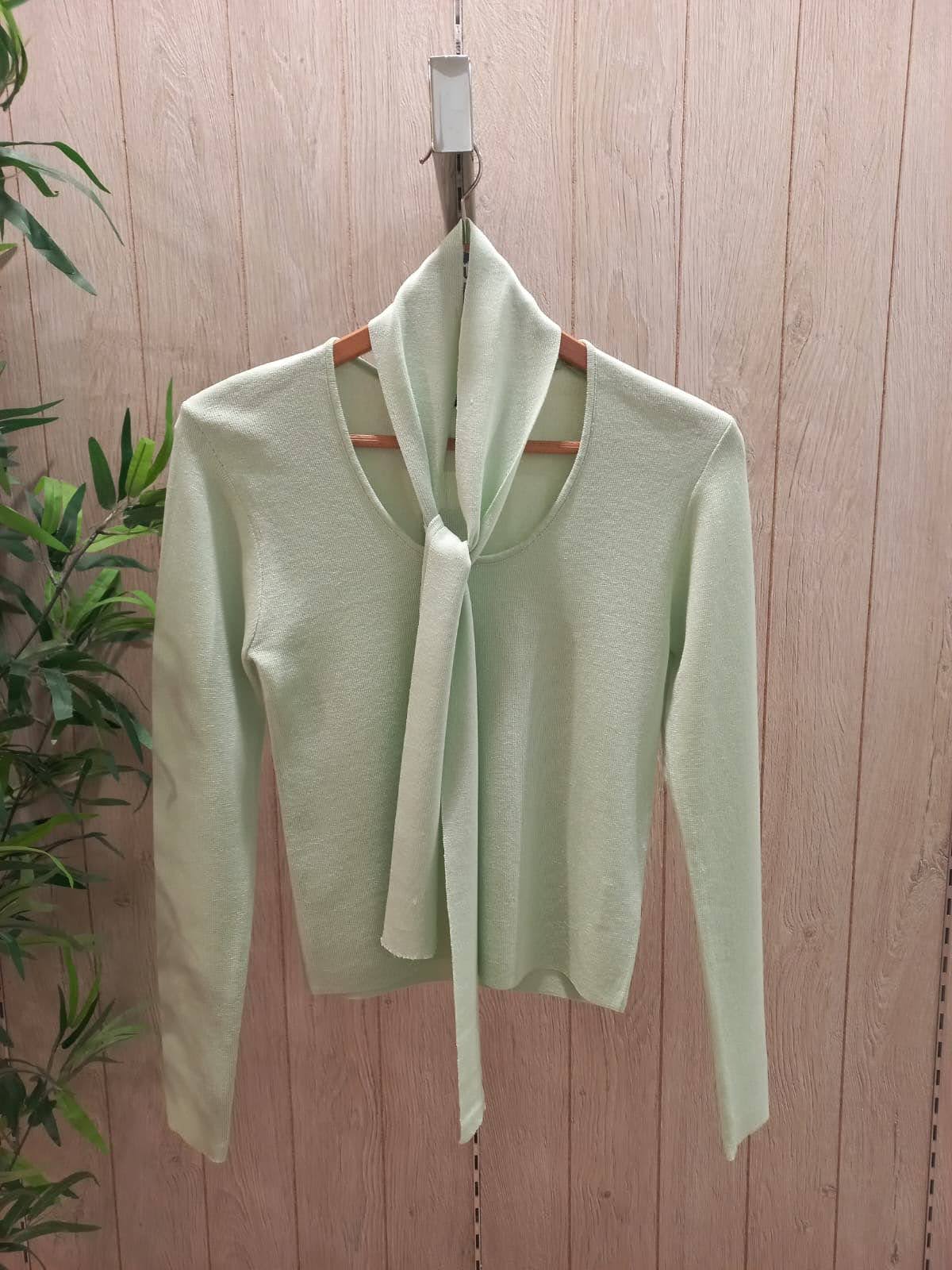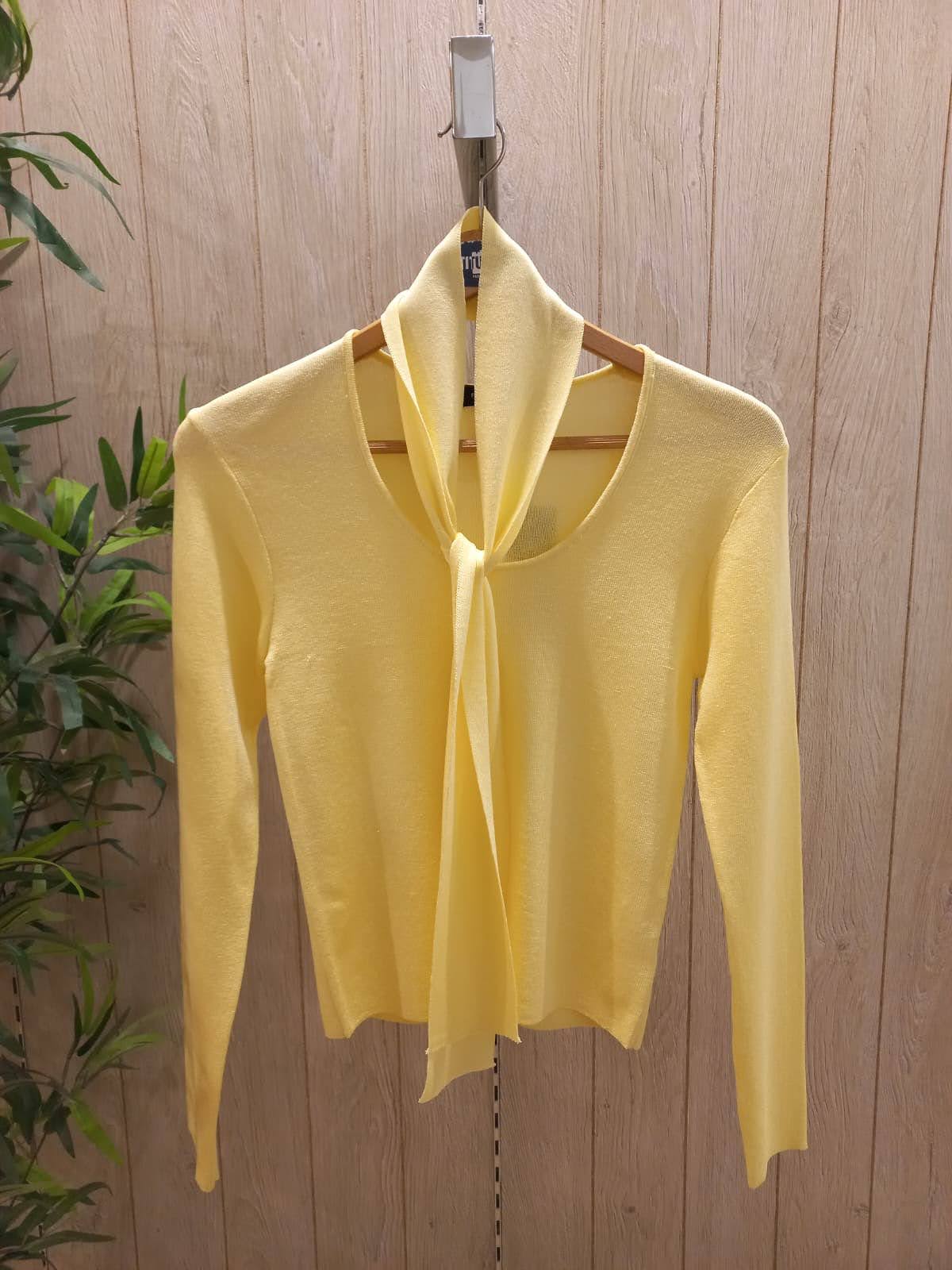 Camisola em malha de manga comprida. O destaque vai para o lenço no decote, que cria um efeito sofisticado e diferente, perfeito para dar um toque especial ao visual sem precisar de acessórios extra. Uma opção versátil para conjugar com calças de cintura subida, saias ou coordenados mais clássicos.