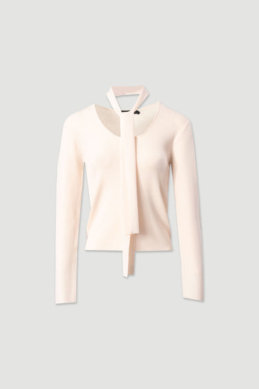 Camisola em malha de manga comprida. O destaque vai para o lenço no decote, que cria um efeito sofisticado e diferente, perfeito para dar um toque especial ao visual sem precisar de acessórios extra. Uma opção versátil para conjugar com calças de cintura subida, saias ou coordenados mais clássicos.