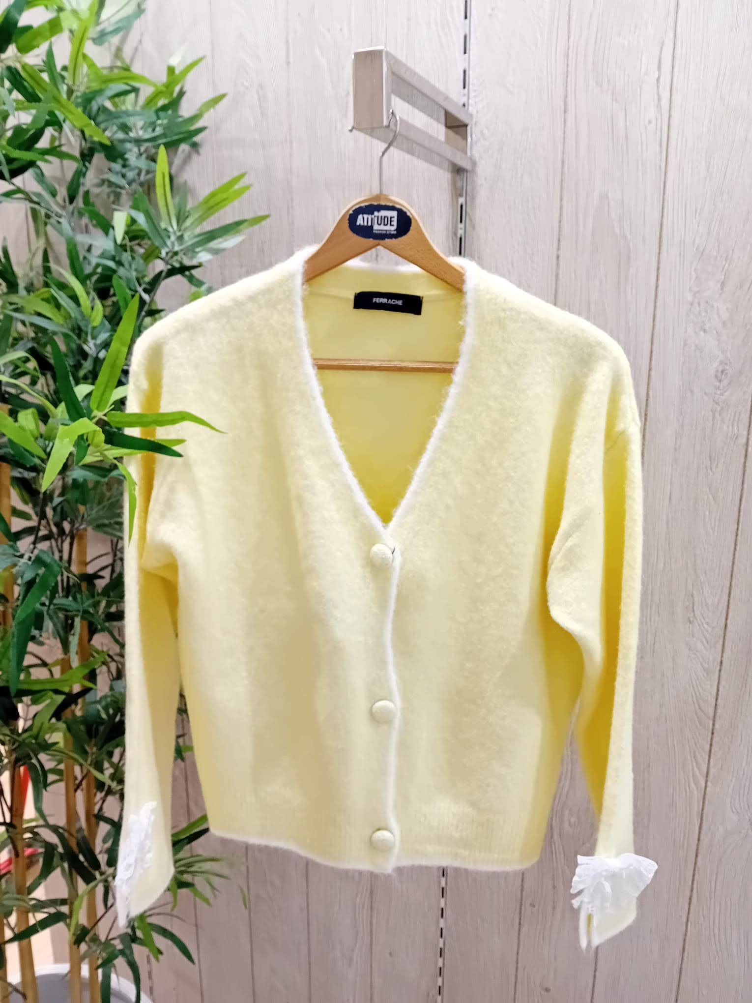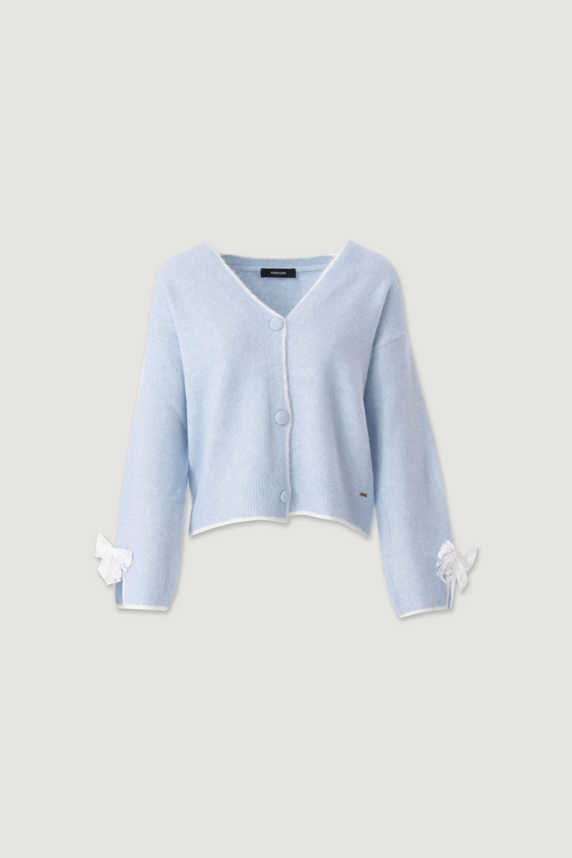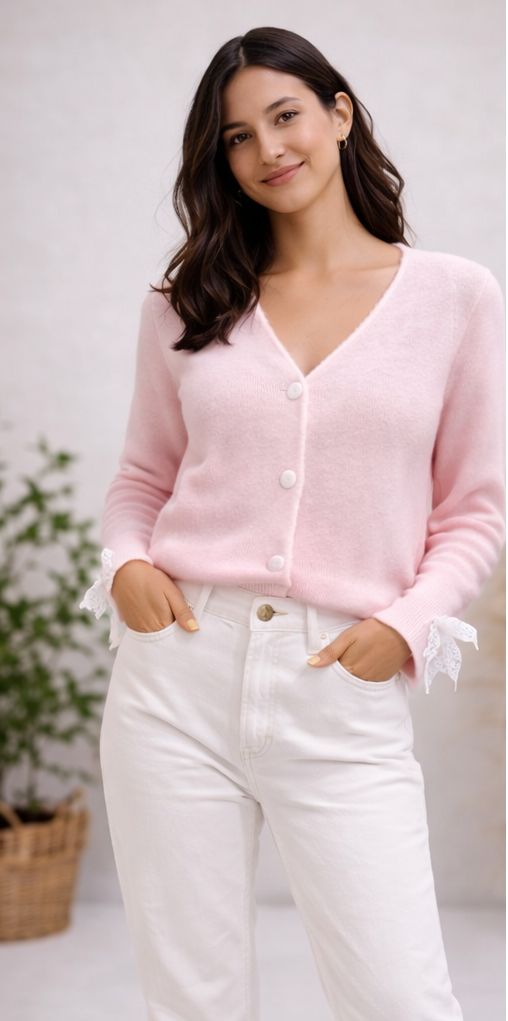 Casaco de malha, com decote em V e fecho frontal por botões forrados no mesmo tom. Confeccionado numa malha suave, destaca-se pelo acabamento contrastante subtil na baínha e no decote. Manga comprida com detalhe de laço em renda nos punhos, que acrescenta um toque romântico e elegante à peça.