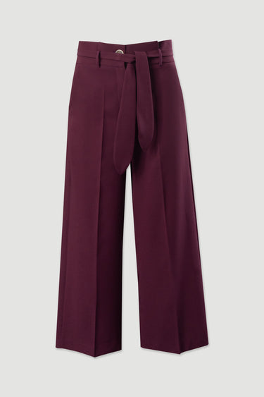 Calça culotte clássica de cintura subida, com pinças na frente e corte fluido que confere movimento e elegância. Apresenta cinto do mesmo tecido e presilhas, adicionando um toque sofisticado ao modelo. Fecho de correr frontal com botão metálico e bolsos laterais funcionais. Uma peça versátil e refinada, perfeita para looks de trabalho ou coordenados mais descontraídos.