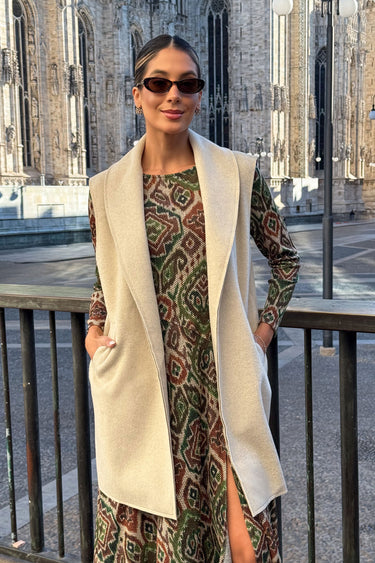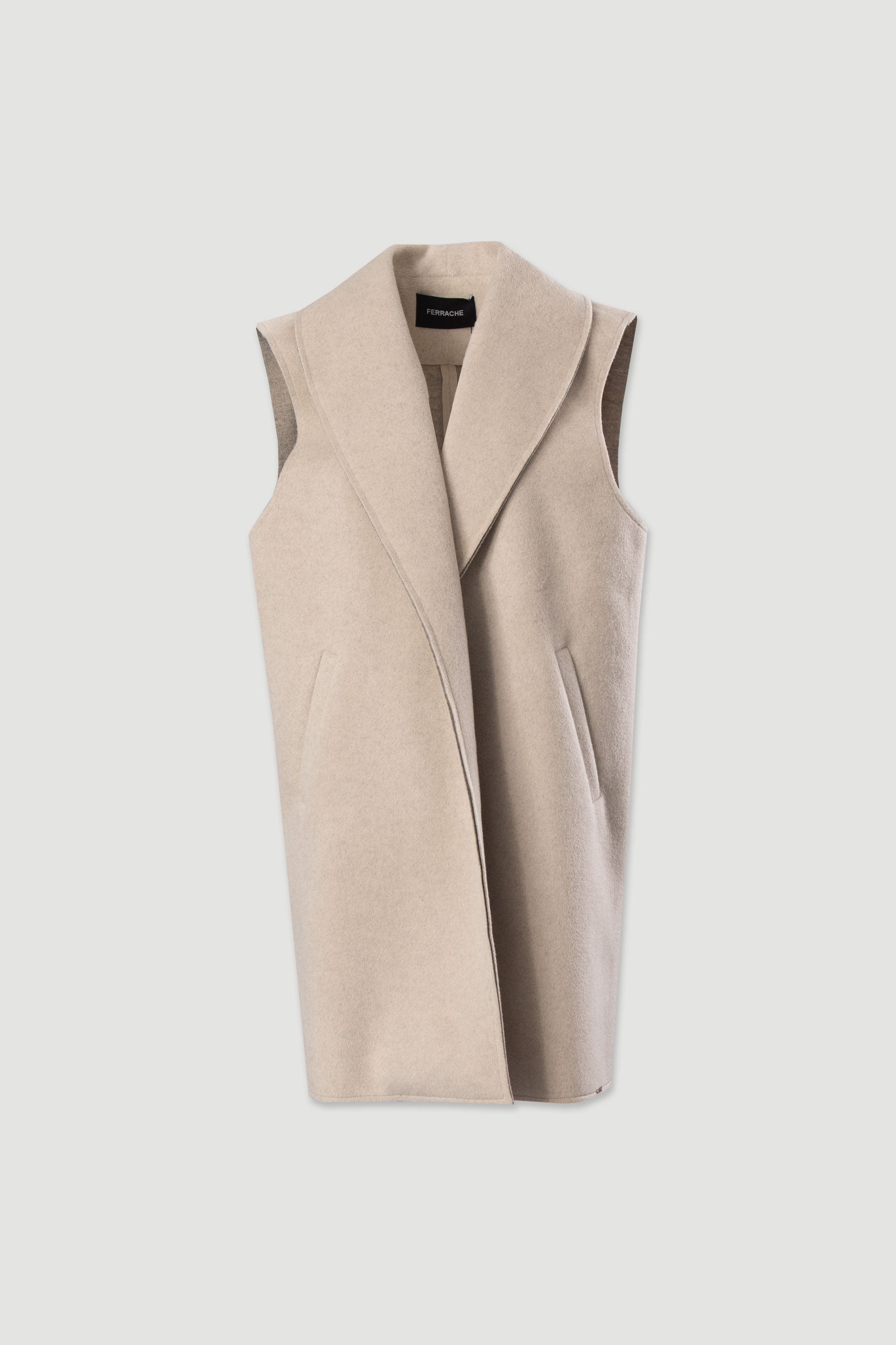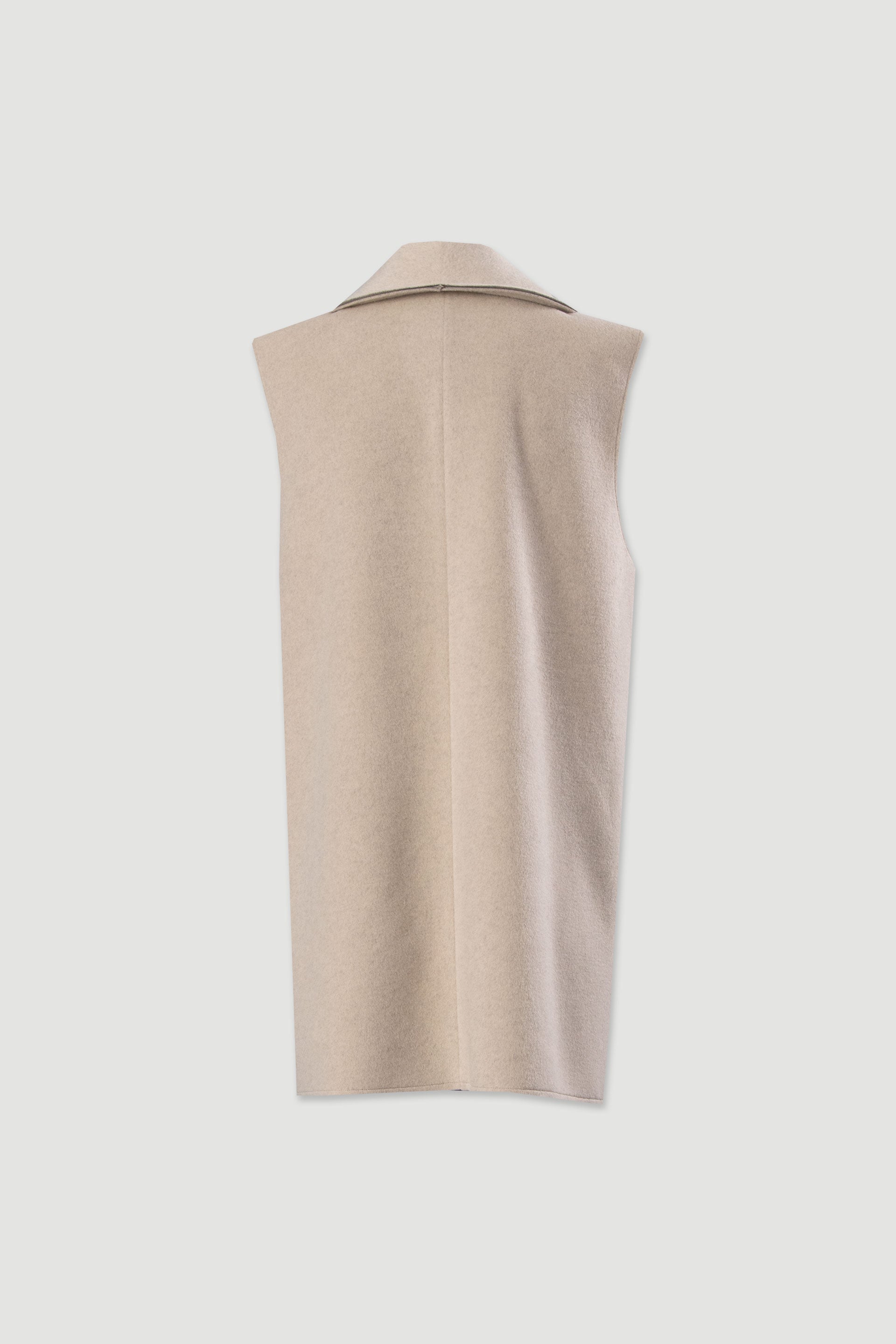 Colete longo em tecido estruturado com corte reto e design minimalista. Apresenta gola ampla que confere sofisticação, bolsos laterais embutidos Uma peça versátil que pode ser usada sobre camisas, malhas ou vestidos, perfeita para composições modernas e elegantes.