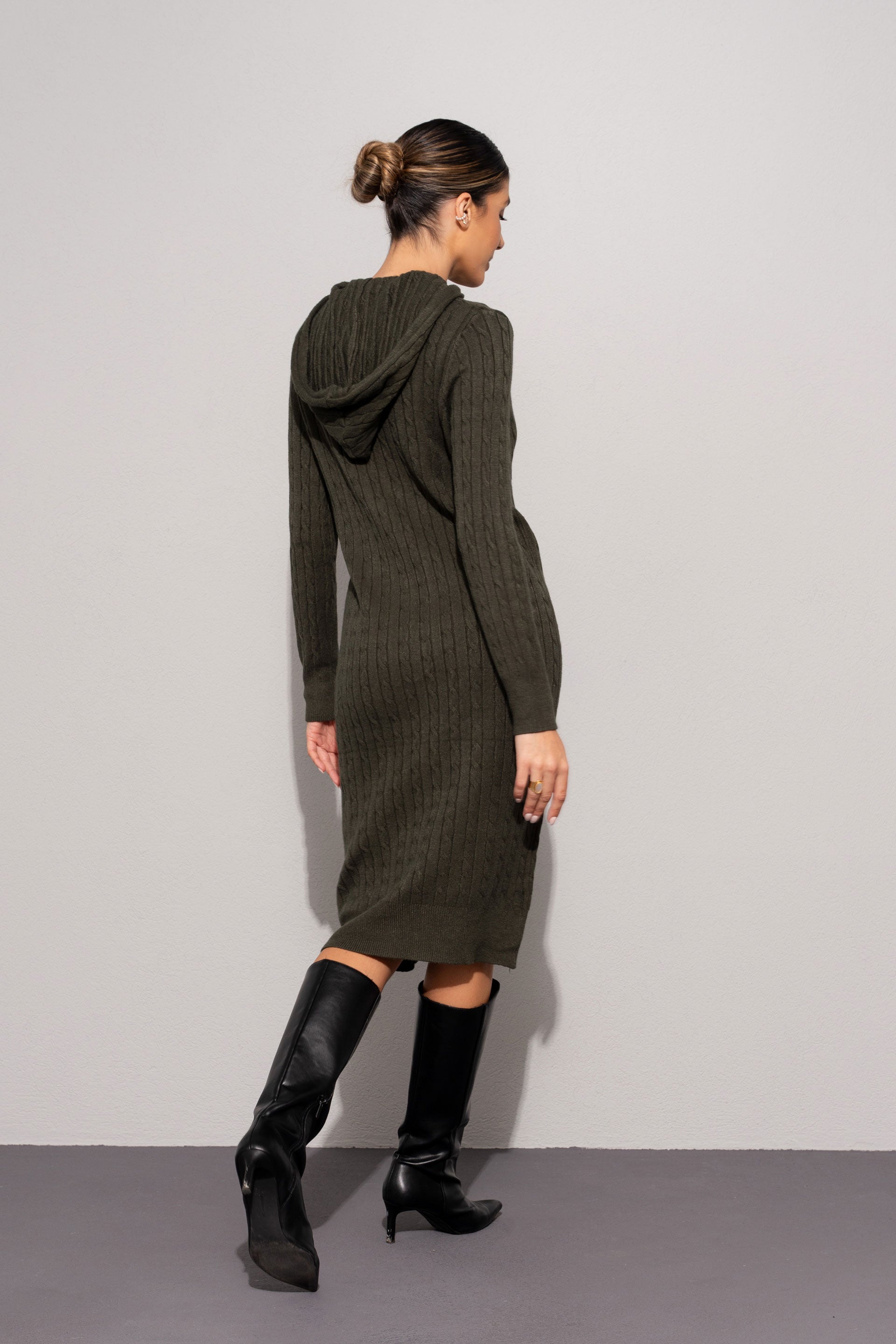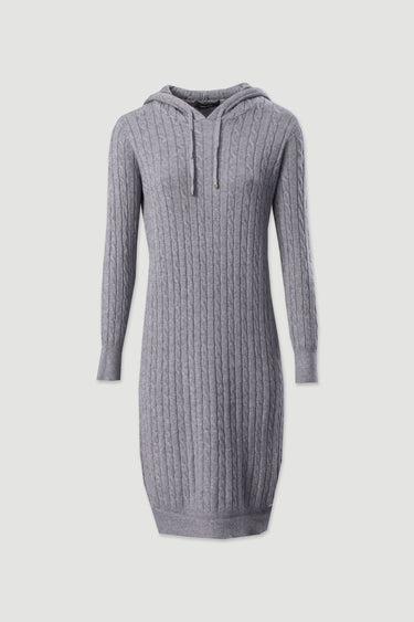 Vestido de malha com capuz, em tricot entrançado, com manga comprida e silhueta ajustada. O design confortável e descontraído combina textura e estilo, perfeito para looks casuais nos dias mais frios. Uma peça prática e moderna, ideal para usar com botas ou ténis.