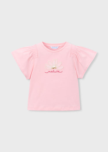 Com manga curta e gola redonda, esta t-shirt Mayoral menina é perfeita para combinar com calções, saias ou leggings, sendo uma peça prática e confortável para o dia a dia.