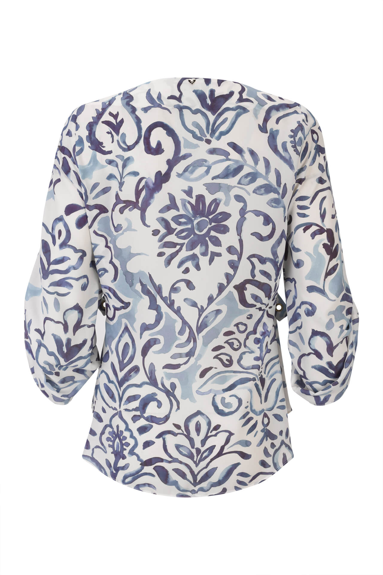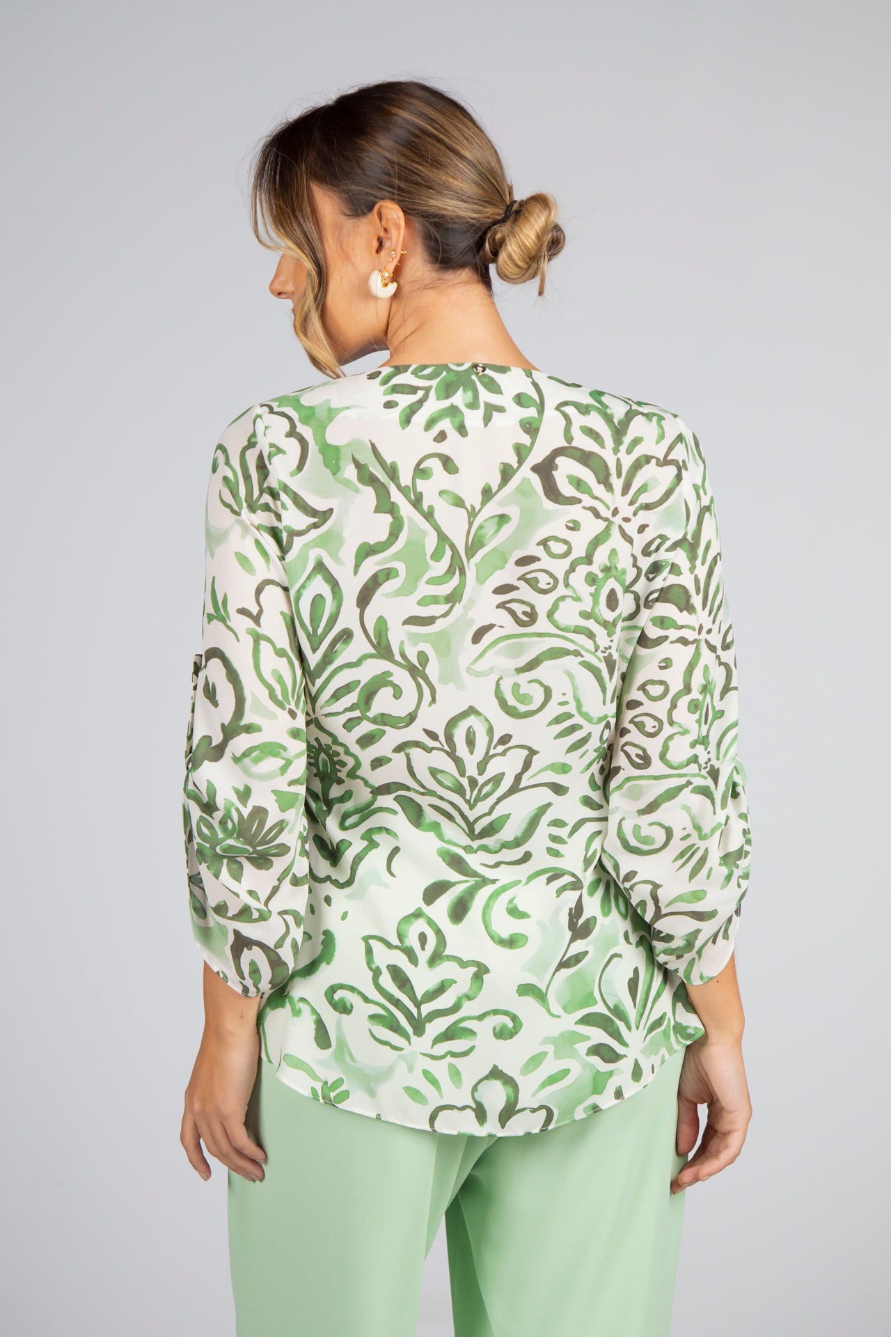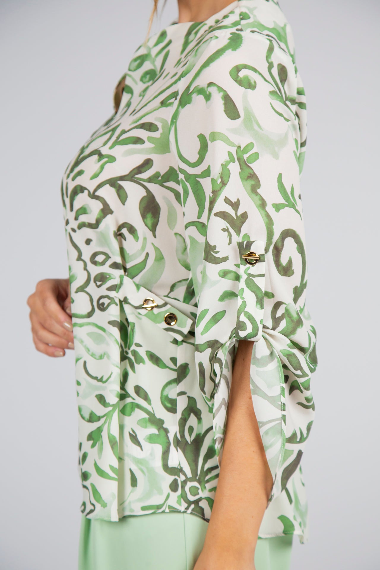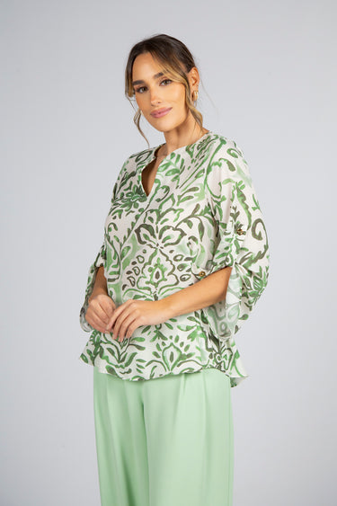 O padrão de inspiração natural combina diferentes nuances de verde de forma harmoniosa, criando um contraste fresco e luminoso que valoriza qualquer coordenado. O decote em V com gola redonda enquadra o colo com discrição e feminilidade, enquanto as mangas 3/4 com ilhós e os detalhes de ilhós laterais acrescentam um toque contemporâneo ao design, mantendo a identidade sofisticada da marca.
