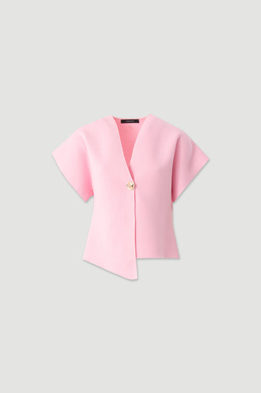 Casaco feminino Ferrache em malha estruturada, com elegante decote em V e fecho frontal por botão personalizado, que acrescenta um detalhe distintivo ao design. As mangas curtas amplas estilo capa criam uma silhueta moderna, fluida e sofisticada, conferindo movimento e originalidade à peça.