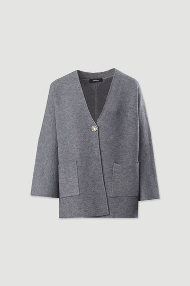 Casaco de malha em tecido texturado com fecho frontal em botão personalizado. De corte reto e comprimento médio, apresenta bolsos frontais aplicados e manga 3/4, conferindo um toque moderno e descontraído. Uma peça versátil e elegante, perfeita para coordenar com looks de meia-estação.