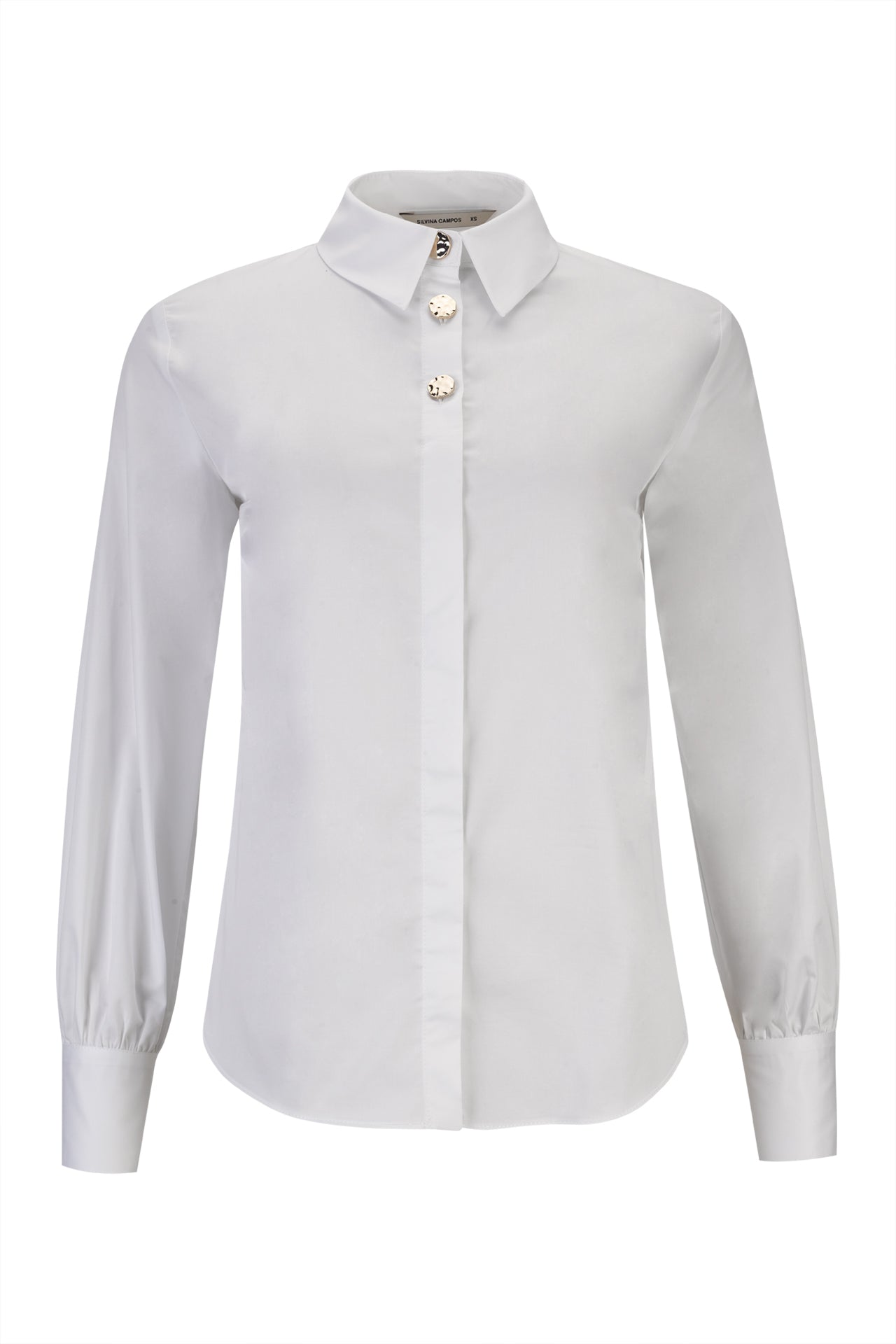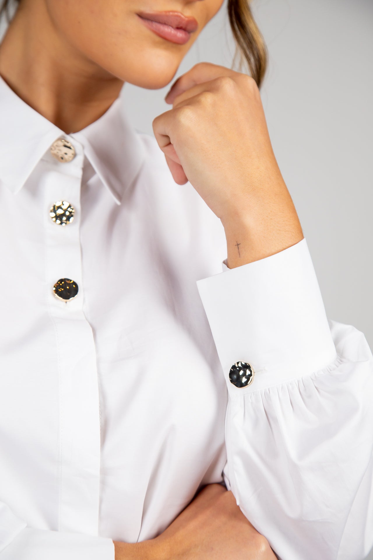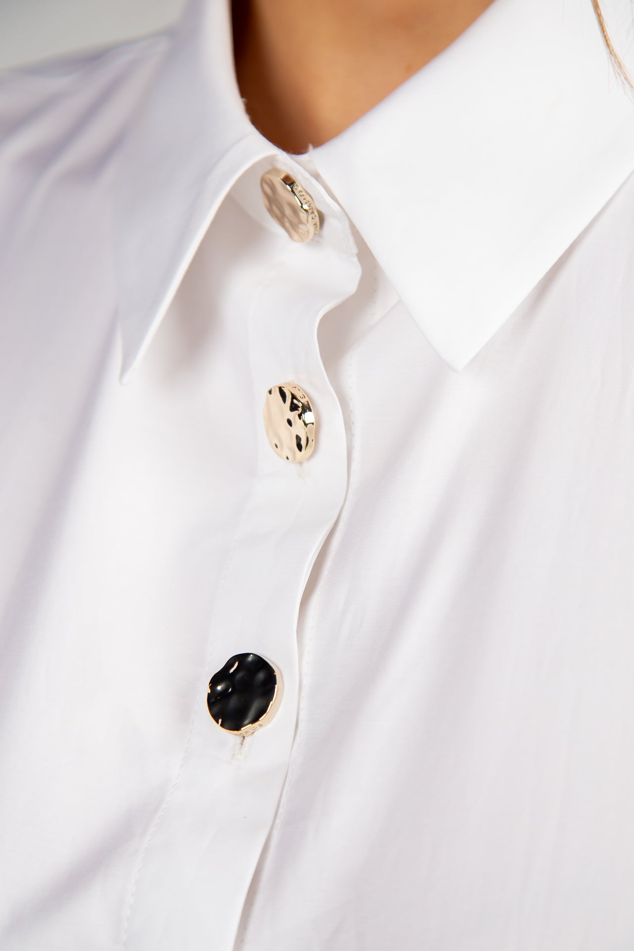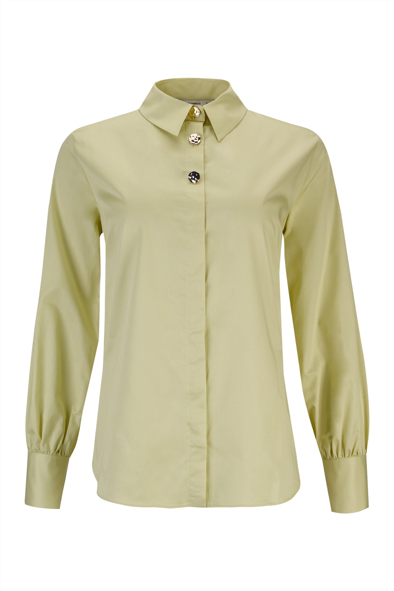 De design liso e minimalista, destaca-se pela sua versatilidade e sofisticação discreta. O modelo apresenta colarinho estruturado e botões dourados visíveis na parte superior, que acrescentam um toque elegante e distintivo, enquanto o restante fecho permanece oculto, criando uma frente clean e refinada.