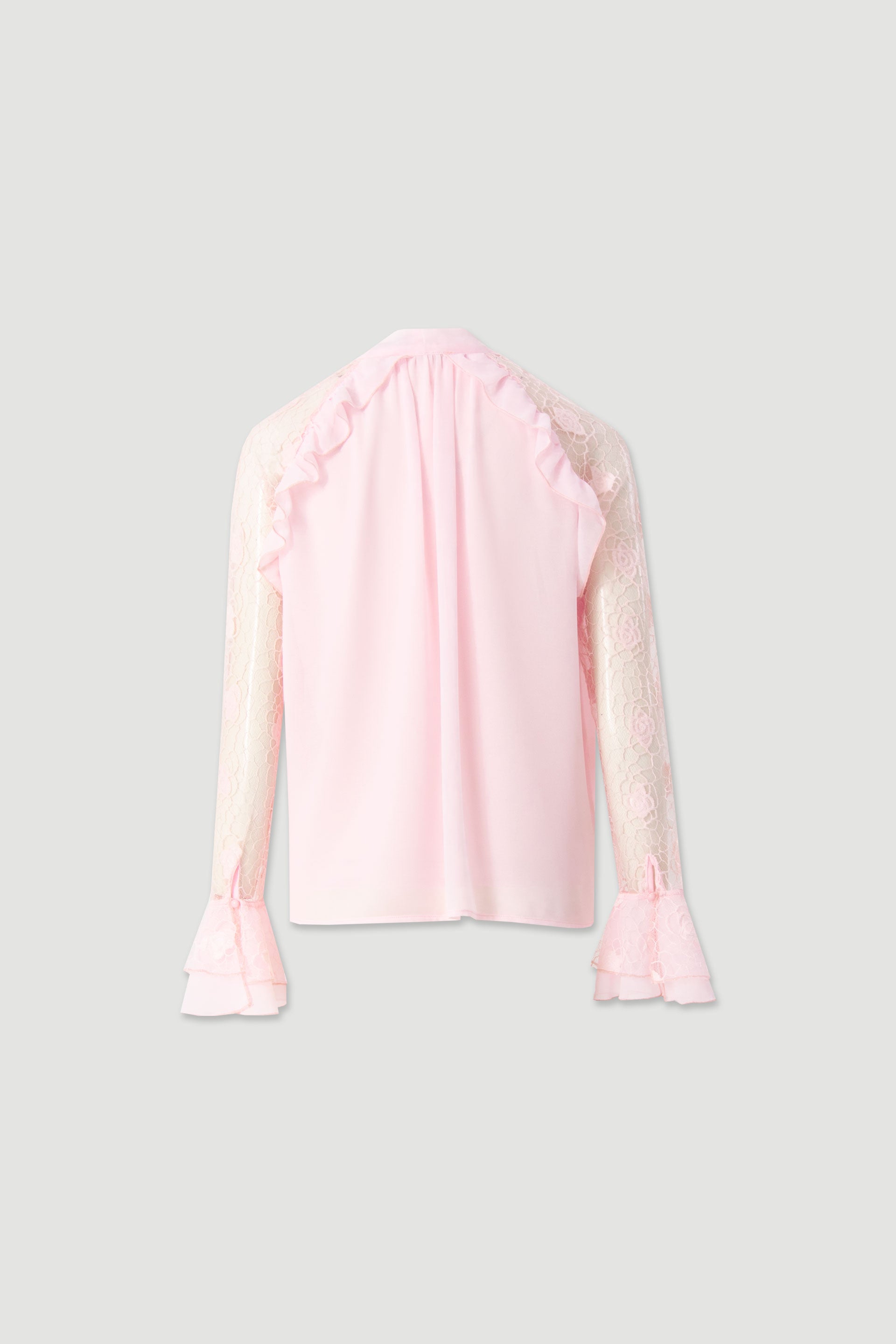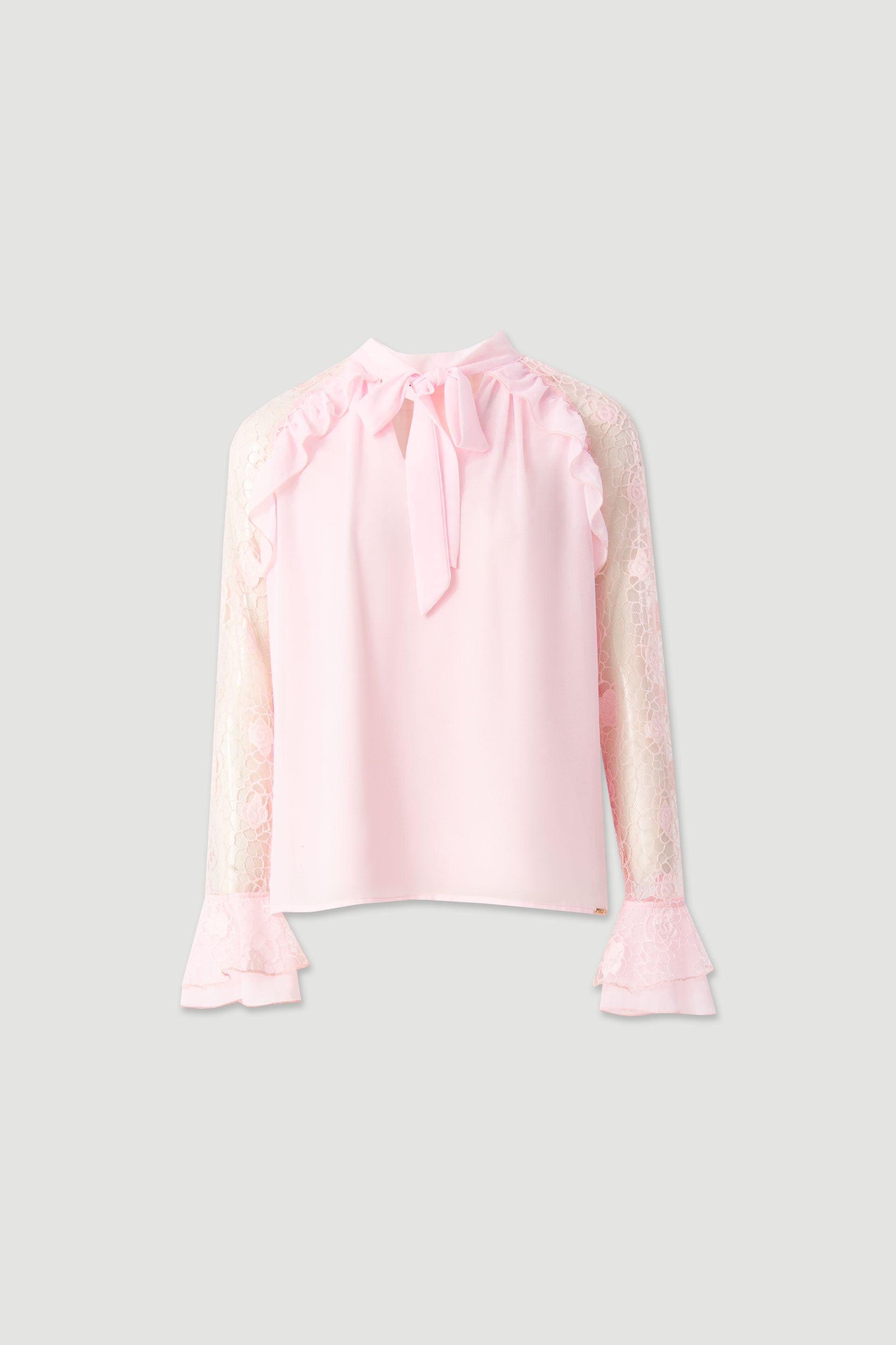 Blusa Ferrache feminina fluida e leve, com gola subida e delicado laço frontal, que acrescenta charme e sofisticação ao visual. O design destaca-se pelas mangas compridas em renda transparente, com punhos em folho, e pelos subtis folhos nos ombros, criando um efeito romântico e elegante.
