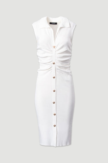 Vestido midi em malha, de silhueta ajustada e feminina, perfeito para um look elegante e atual. Modelo sem mangas com colarinho e decote em V, com fecho frontal por botões metálicos. O detalhe de franzido na zona da cintura valoriza a figura e acrescenta um toque sofisticado, ideal para usar com sandálias, mules ou blazer para ocasiões especiais.