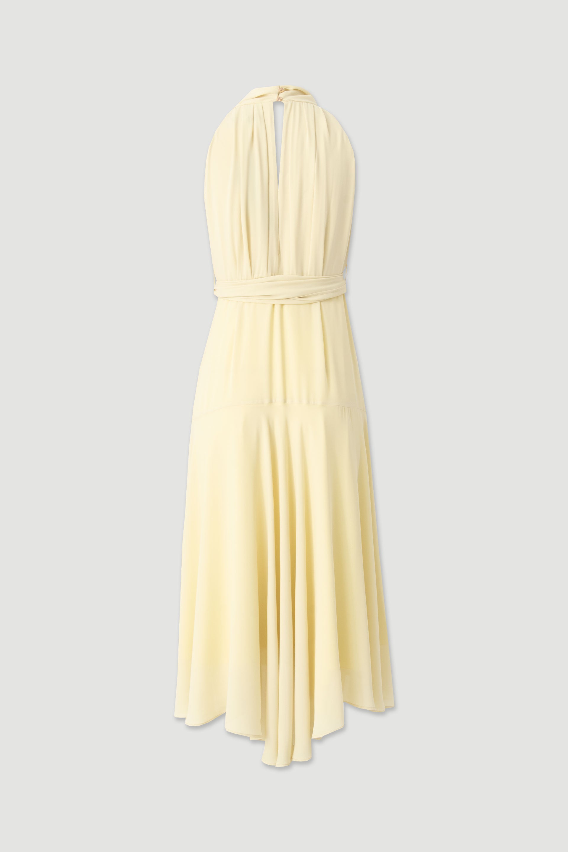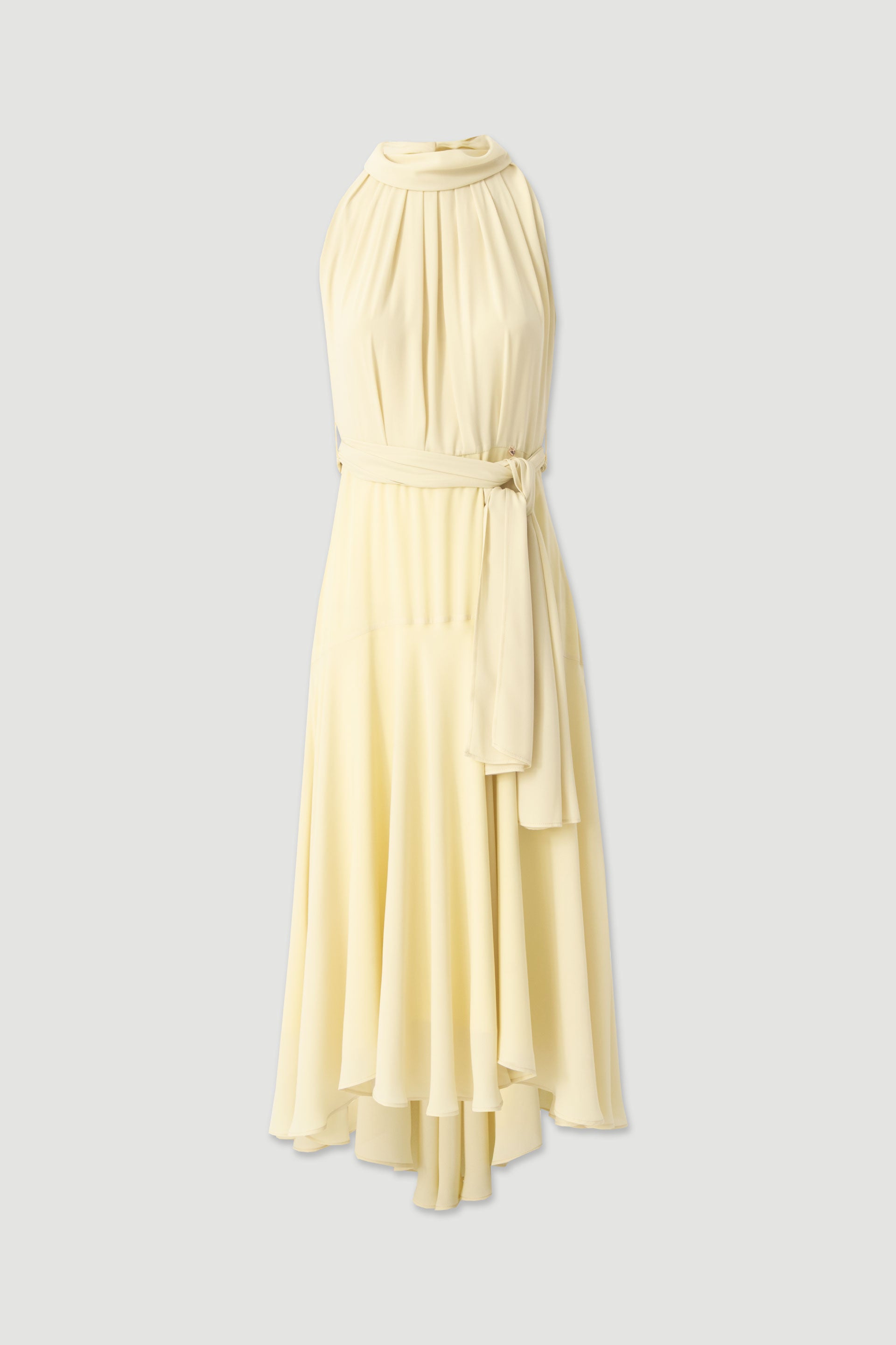 O design apresenta gola subida com pregas delicadas, criando um efeito elegante e refinado. O modelo sem mangas valoriza a silhueta e a cintura é definida por um cinto no mesmo tecido, permitindo um ajuste harmonioso ao corpo. Inclui ainda fecho lateral discreto para maior conforto.