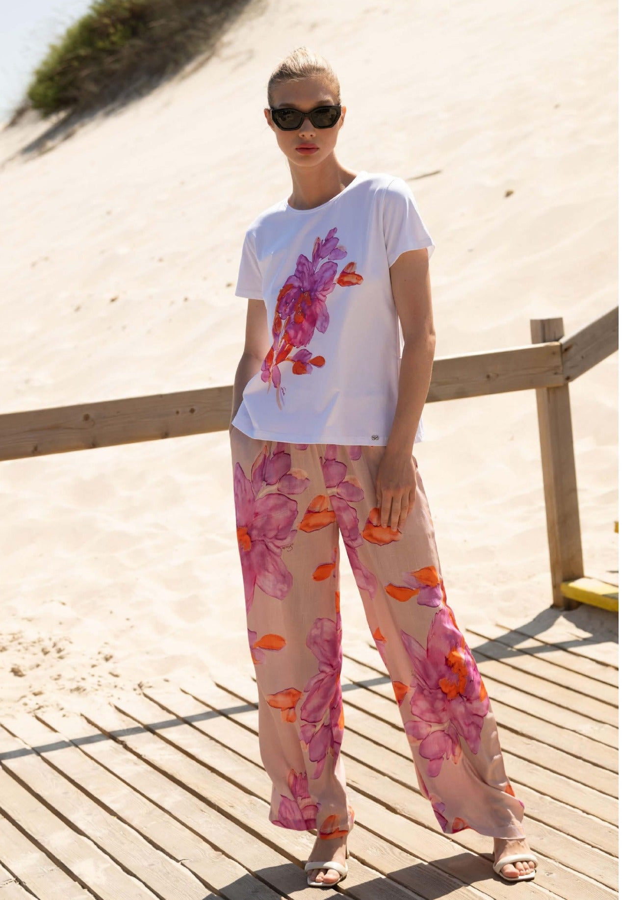 Calças da scusi com estampado flroal de verão em tons de bege e rosa Calças da scusi com estampado flroal de verão em tons de bege e rosa
