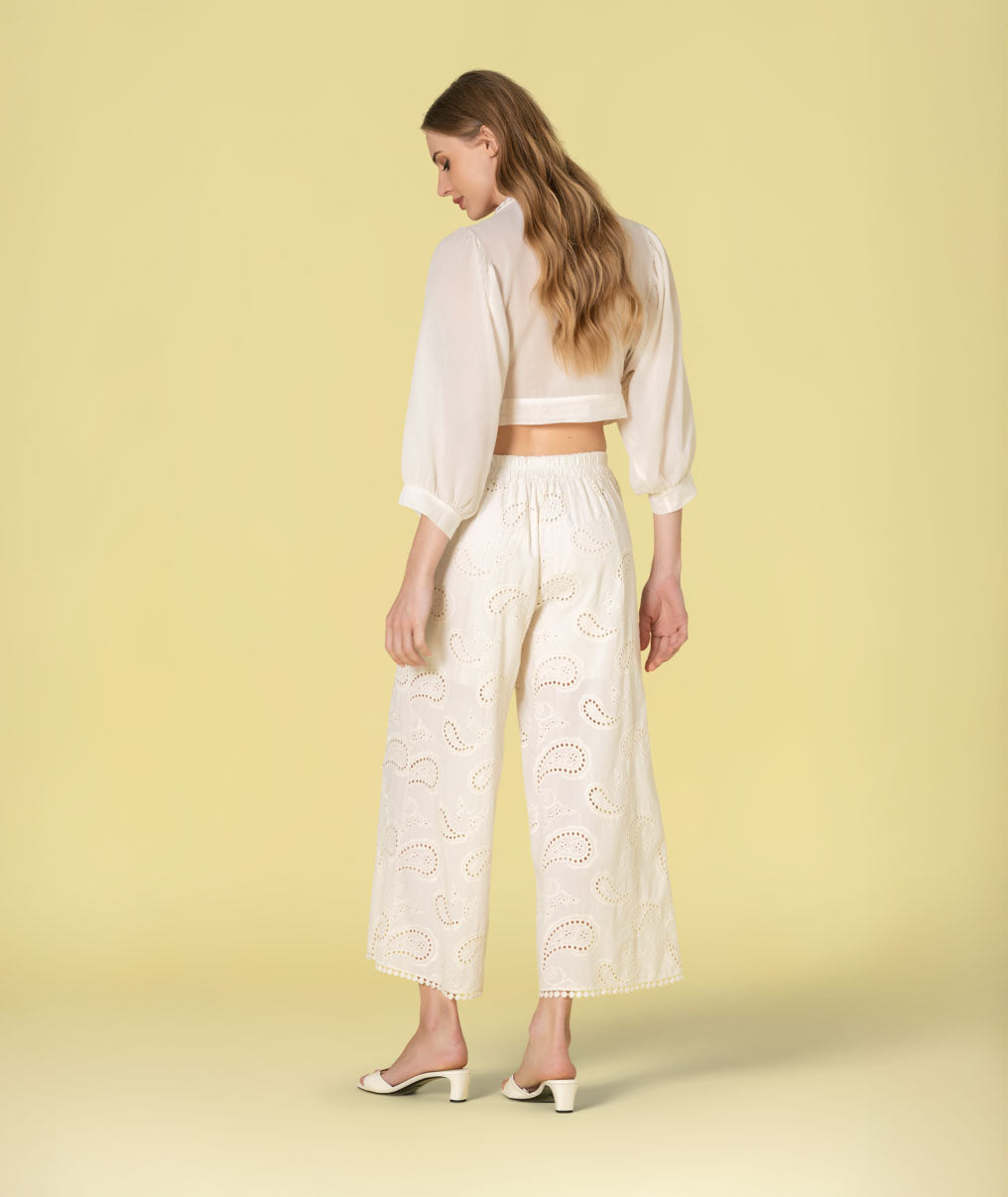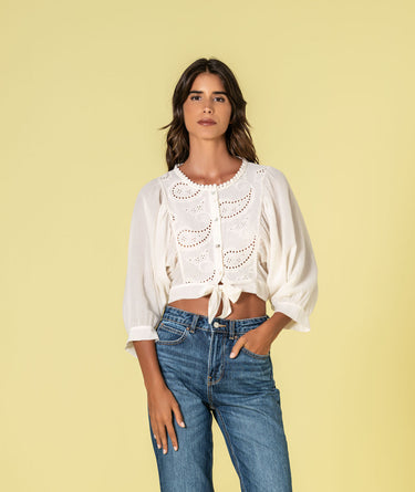 Blusa branca bordada da Ruga com mangas volumosas e nó frontal. Blusa branca bordada da Ruga com mangas volumosas e nó frontal.