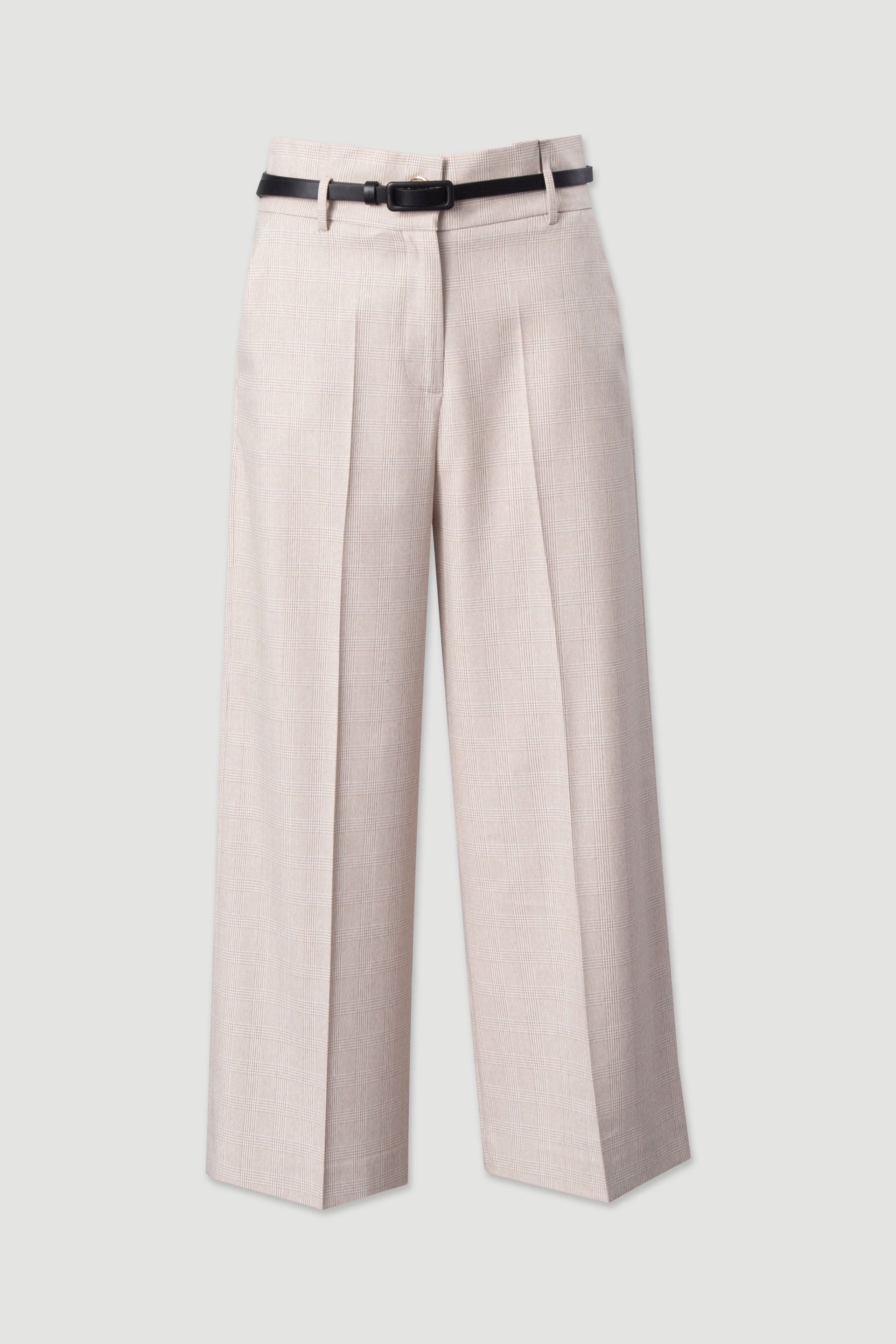 Calça culotte wide leg em tecido com padrão. Cintura subida e detalhe de pregas para um cair elegante. Inclui cinto com efeito de pele em contraste, que acrescenta um toque moderno. Bolsos frontais e fecho de correr frontal e botão metálico personalizado com logotipo.