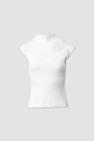 Camisola de malha justa, com detalhe sofisticado em renda na parte superior e nas mangas. Gola subida e manga curta, perfeita para um look feminino e elegante. Ideal para conjugar com calças de cintura subida ou saias.