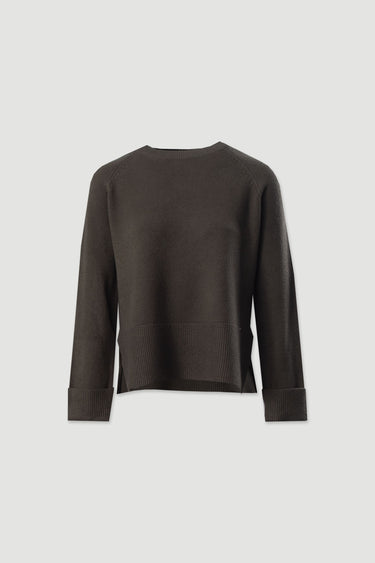 Camisola de malha de corte reto, com decote redondo e mangas compridas. A barra larga em canelado confere estrutura ao design minimalista, enquanto os punhos virados acrescentam um toque descontraído e moderno. Uma peça confortável, versátil e perfeita para coordenados casuais ou elegantes do dia a dia.