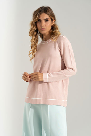 Camisola Ferrache em malha suave, de corte direito e confortável. Destaca-se pelos botões decorativos nos ombros, que acrescentam um toque elegante e moderno ao design minimalista. Apresenta manga comprida e acabamento em contraste subtil na gola, punhos e bainha. Uma peça versátil, ideal para looks casuais refinados ou coordenados mais sofisticados.