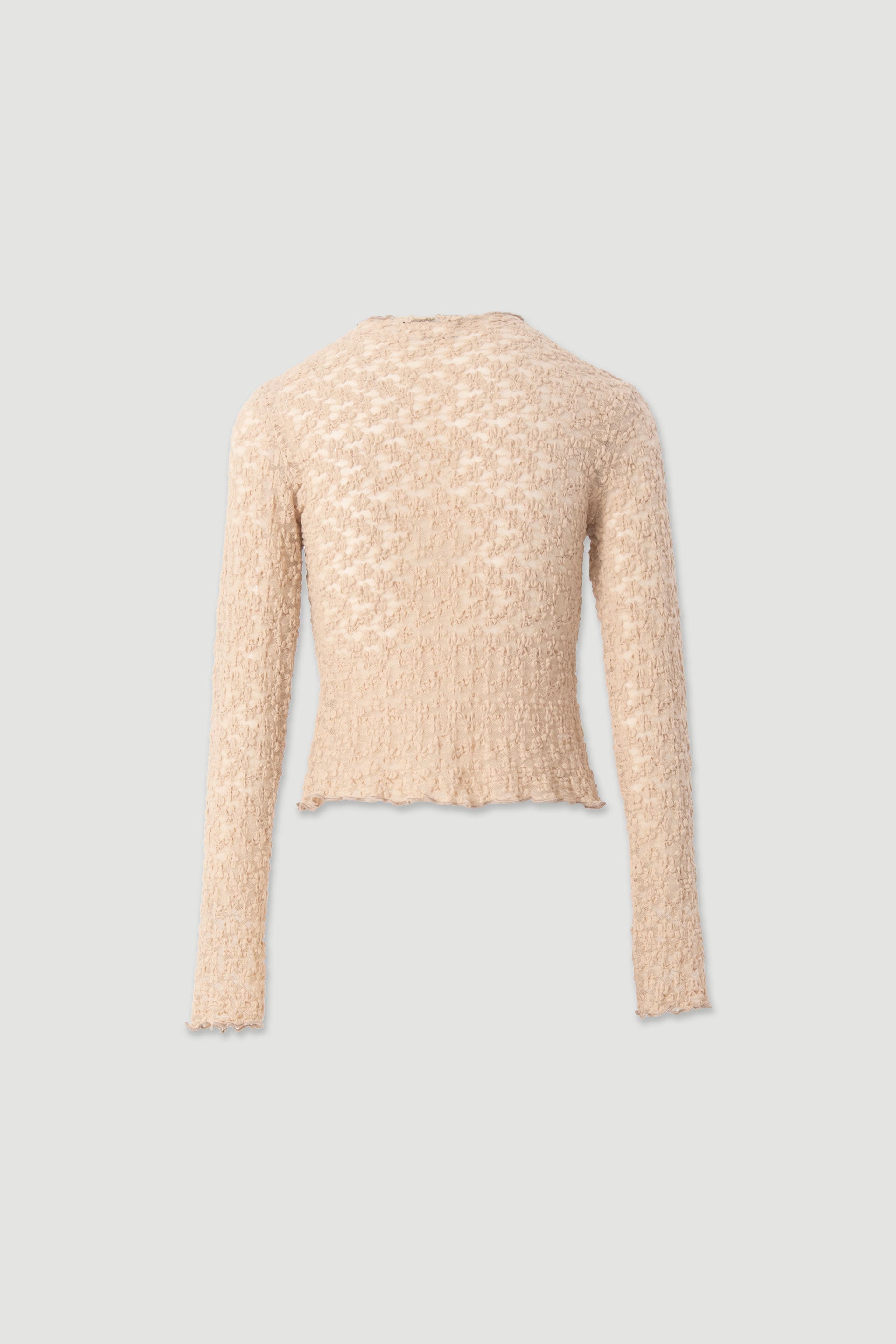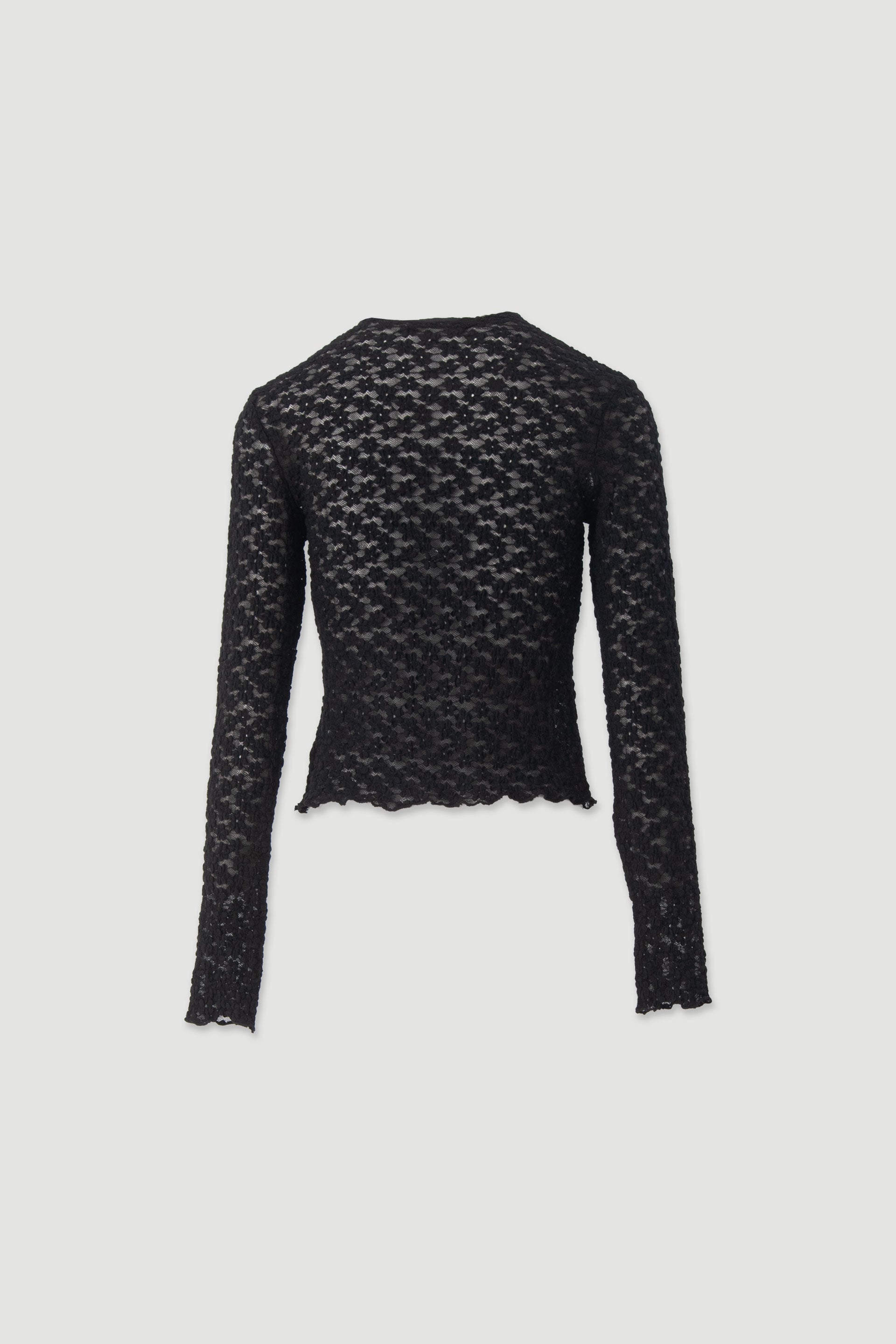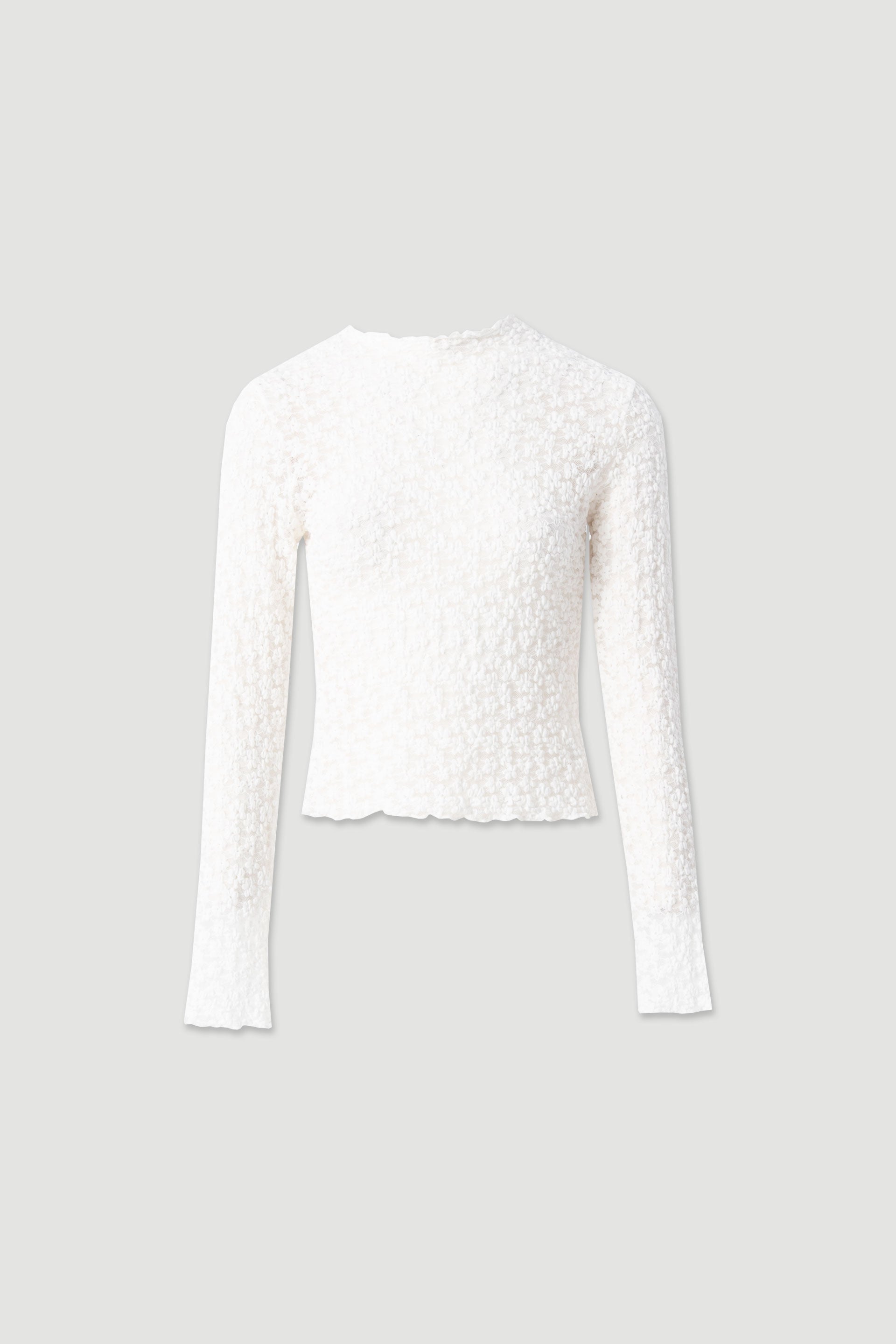 Camisola feminina em renda delicada, com elegante padrão floral e textura suave ao toque. De corte ajustado, esta peça realça a silhueta feminina, enquanto a gola redonda e as mangas compridas garantem um visual equilibrado entre o romântico e o sofisticado.
