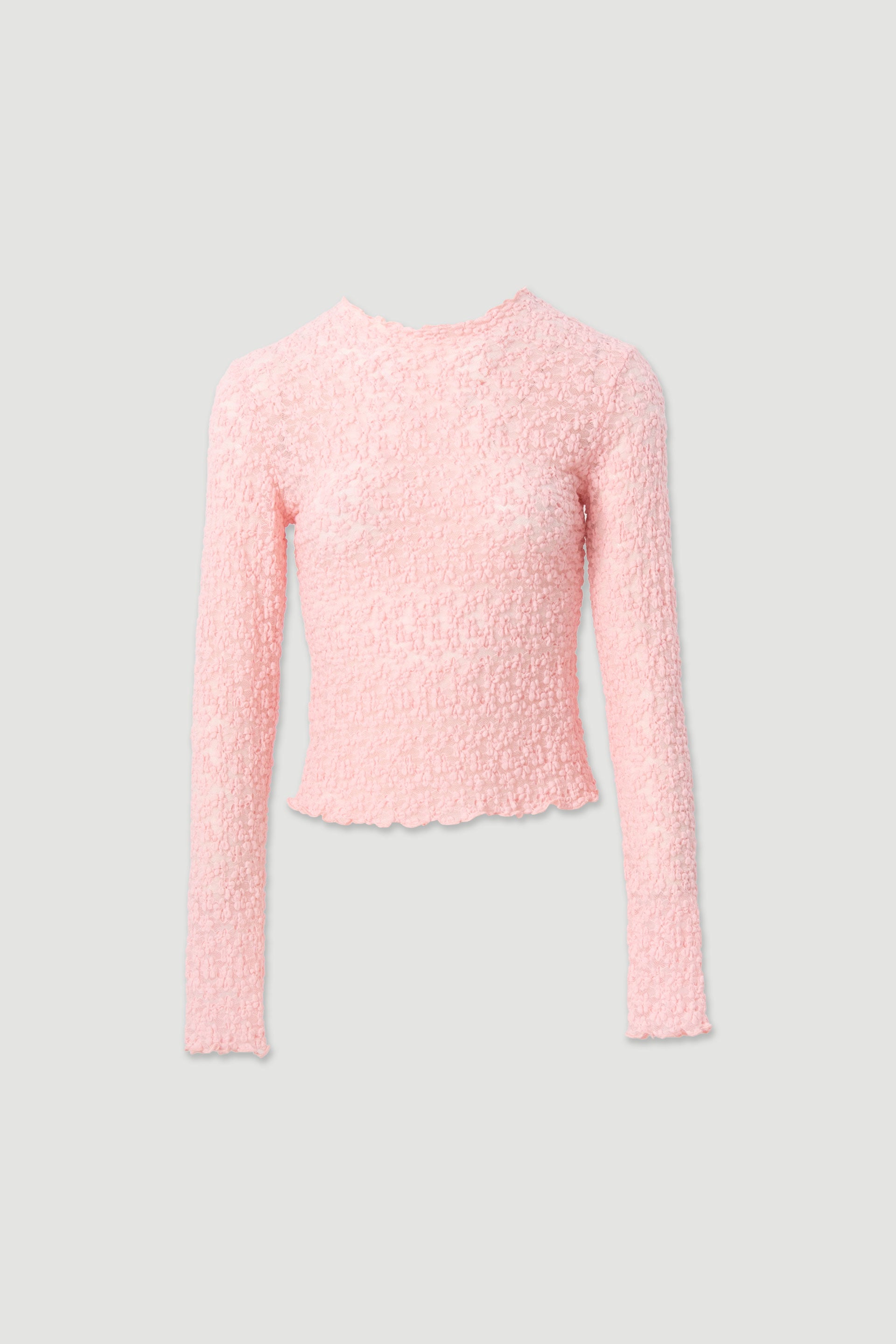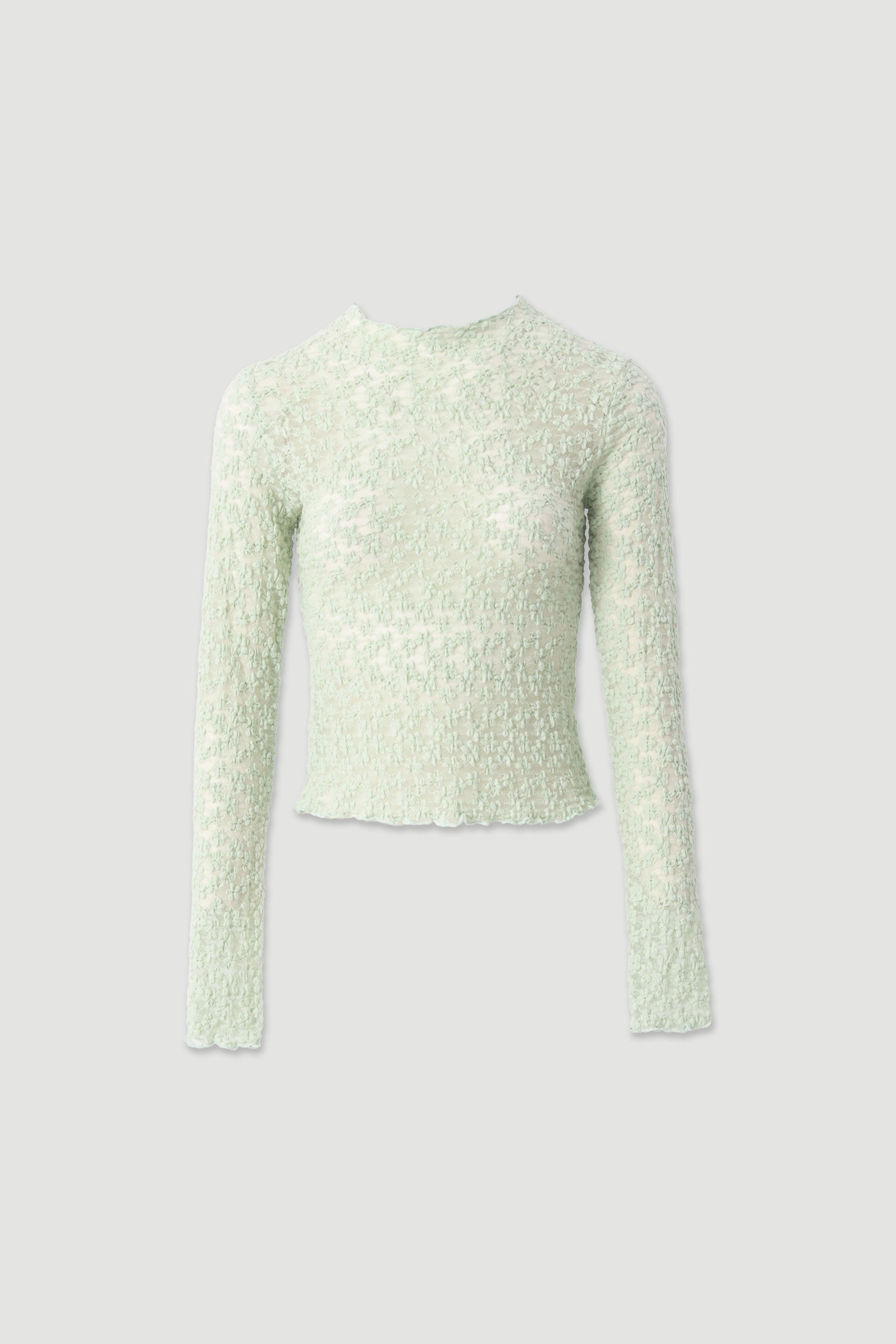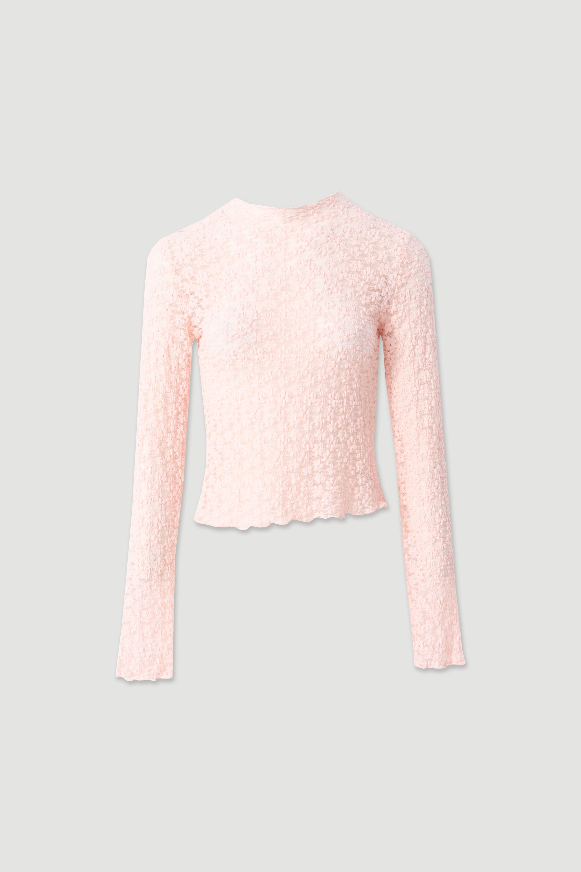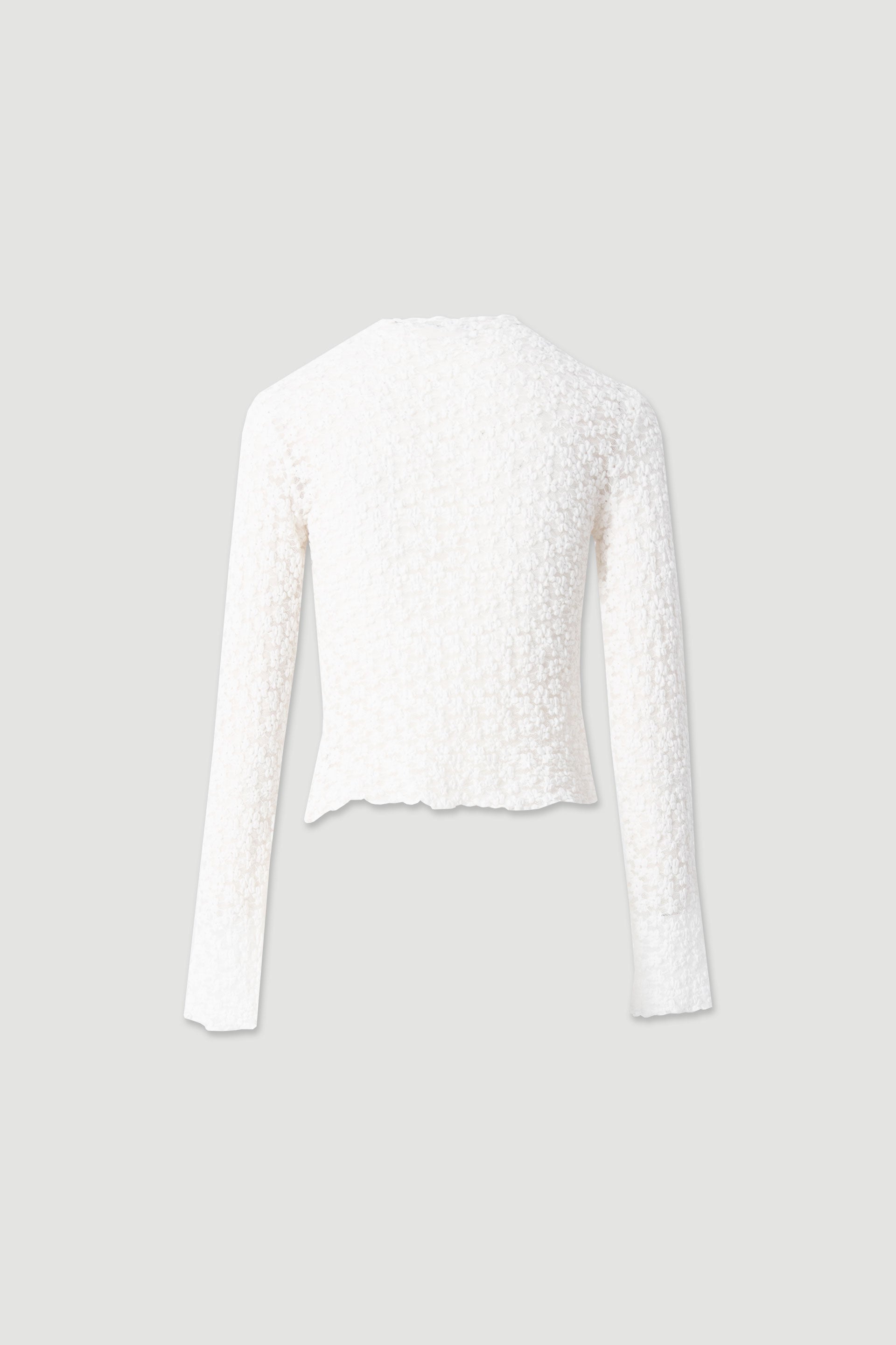 Camisola feminina em renda delicada, com elegante padrão floral e textura suave ao toque. De corte ajustado, esta peça realça a silhueta feminina, enquanto a gola redonda e as mangas compridas garantem um visual equilibrado entre o romântico e o sofisticado.