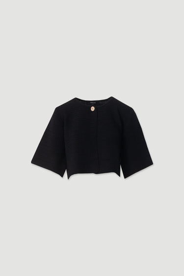 Casaco feminino curto com textura trabalhada, ideal para acrescentar sofisticação e elegância a qualquer look. Apresenta decote redondo e fecho frontal por botão, garantindo um acabamento clássico e refinado. As mangas 3/4 conferem leveza e versatilidade à peça, tornando este casaco perfeito para coordenados do dia a dia, looks de trabalho ou combinações mais elegantes.