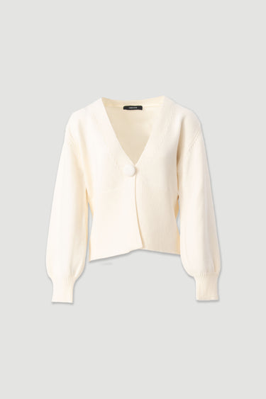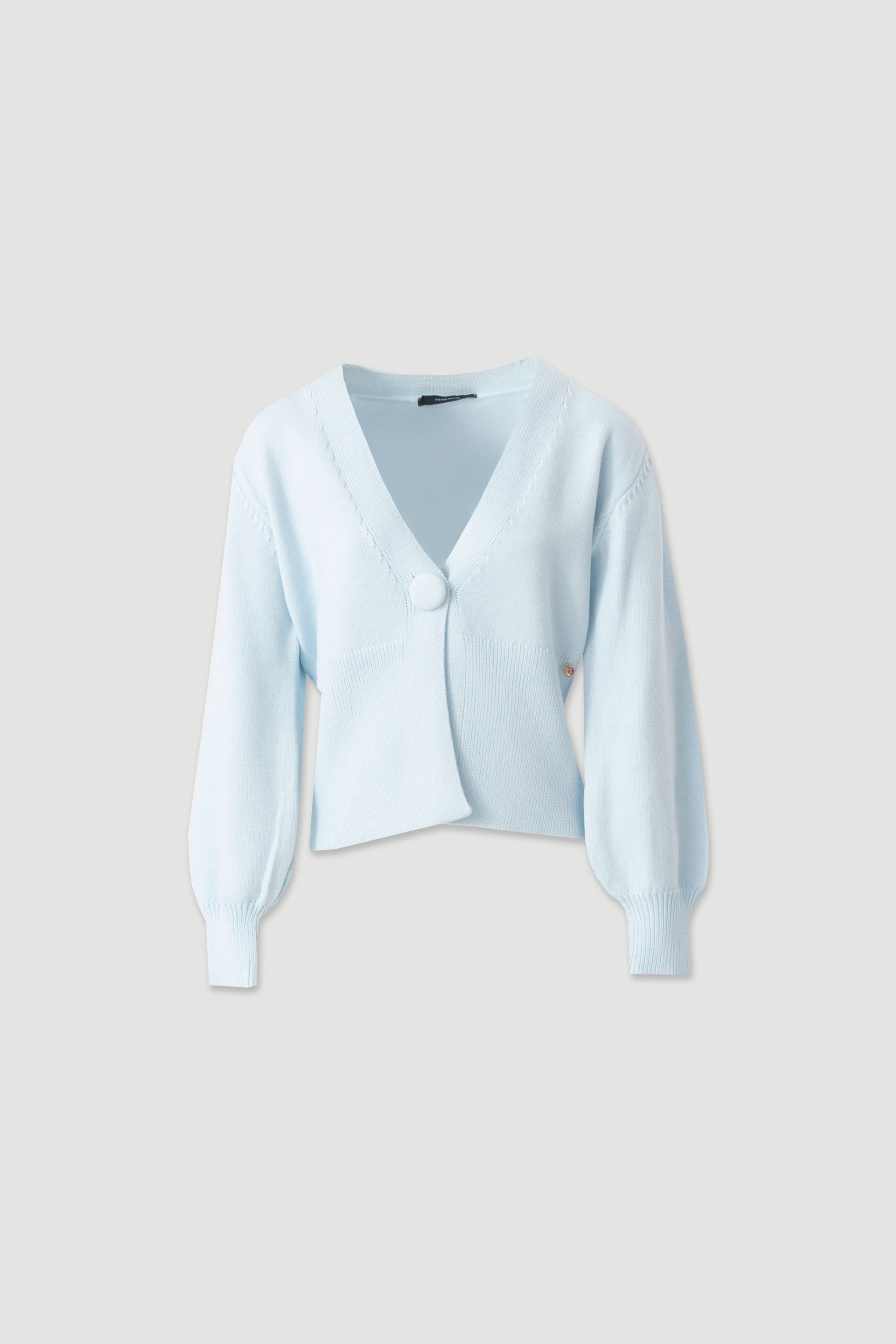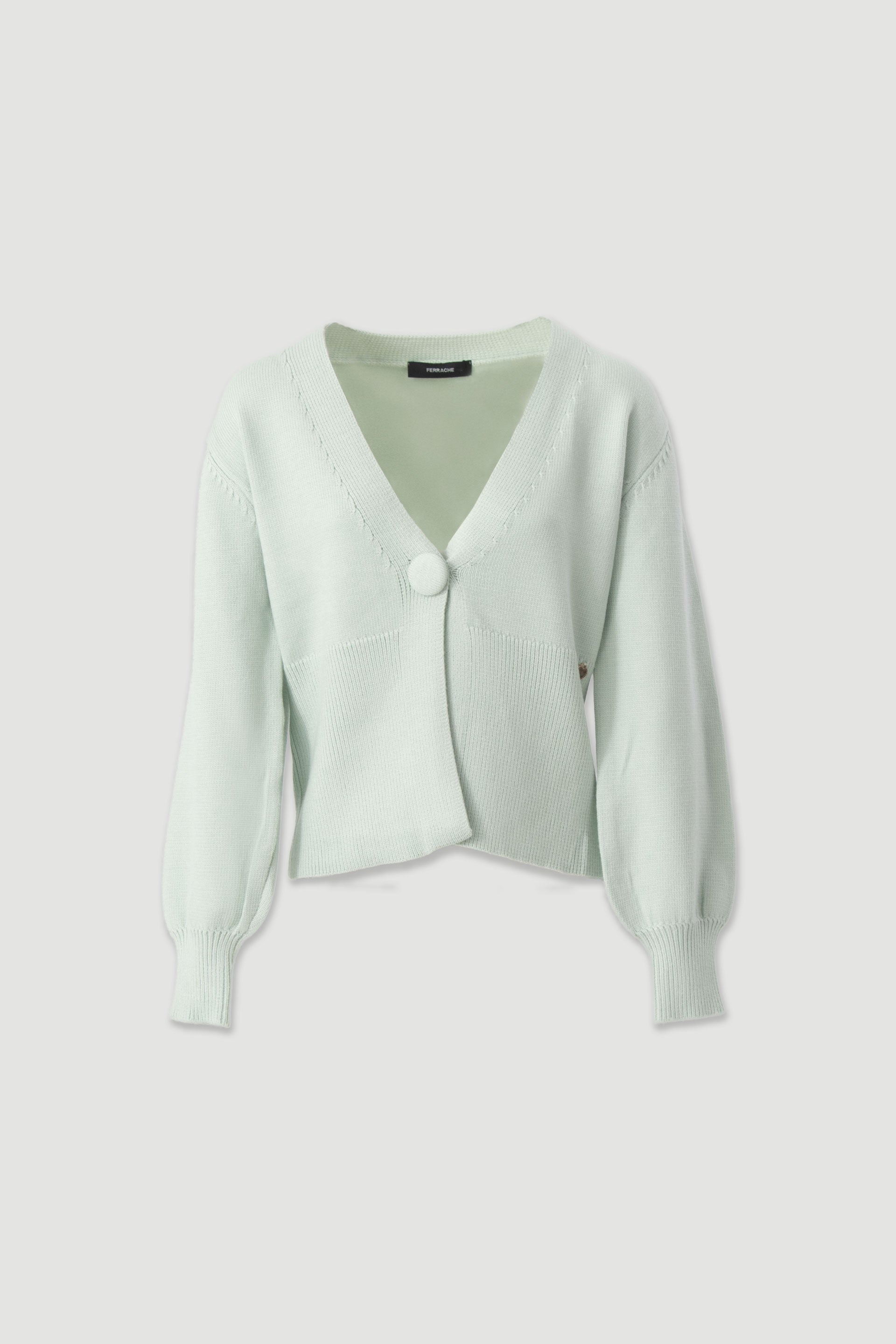 Casaco da Ferrache em malha macia, com decote em V e fecho frontal com botão forrado. De mangas compridas com punho canelado e acabamento delicado na bainha, garantindo conforto e uma vestibilidade elegante. Uma peça versátil e sofisticada, ideal para complementar coordenados casuais ou looks mais cuidados.