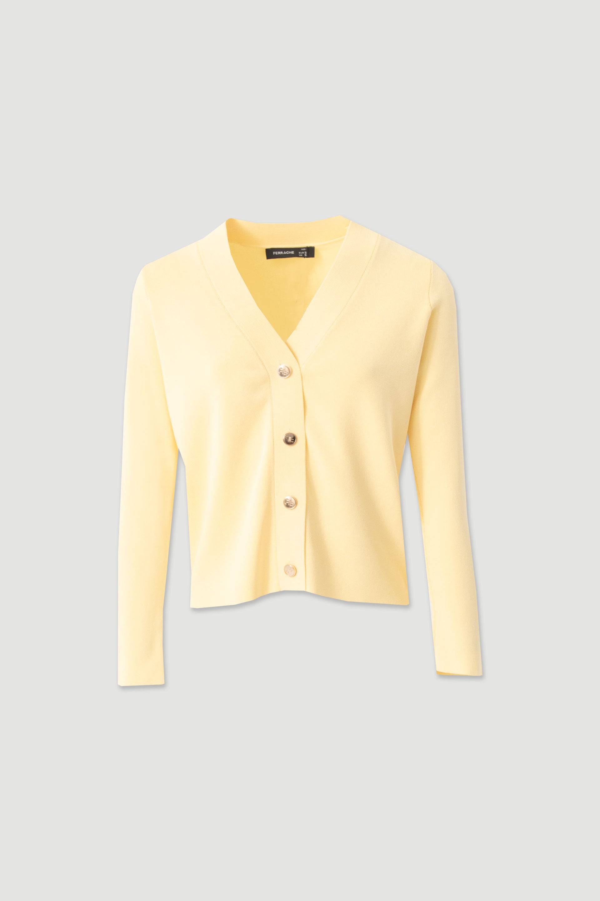 Casaco de malha macia da Ferrache, com decote em V e fecho frontal com botões dourados. Casaco de malha macia da Ferrache, com decote em V e fecho frontal com botões dourados.