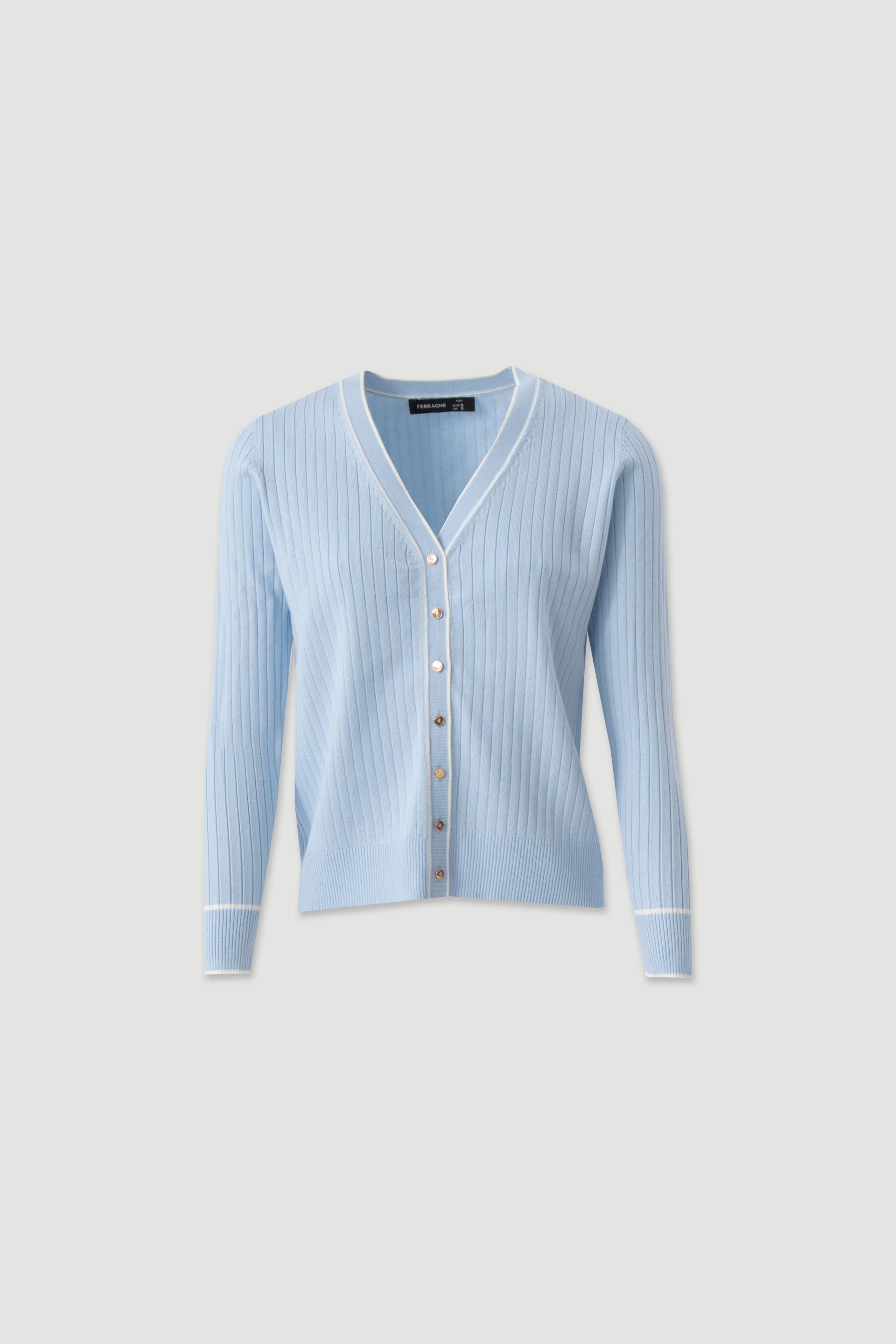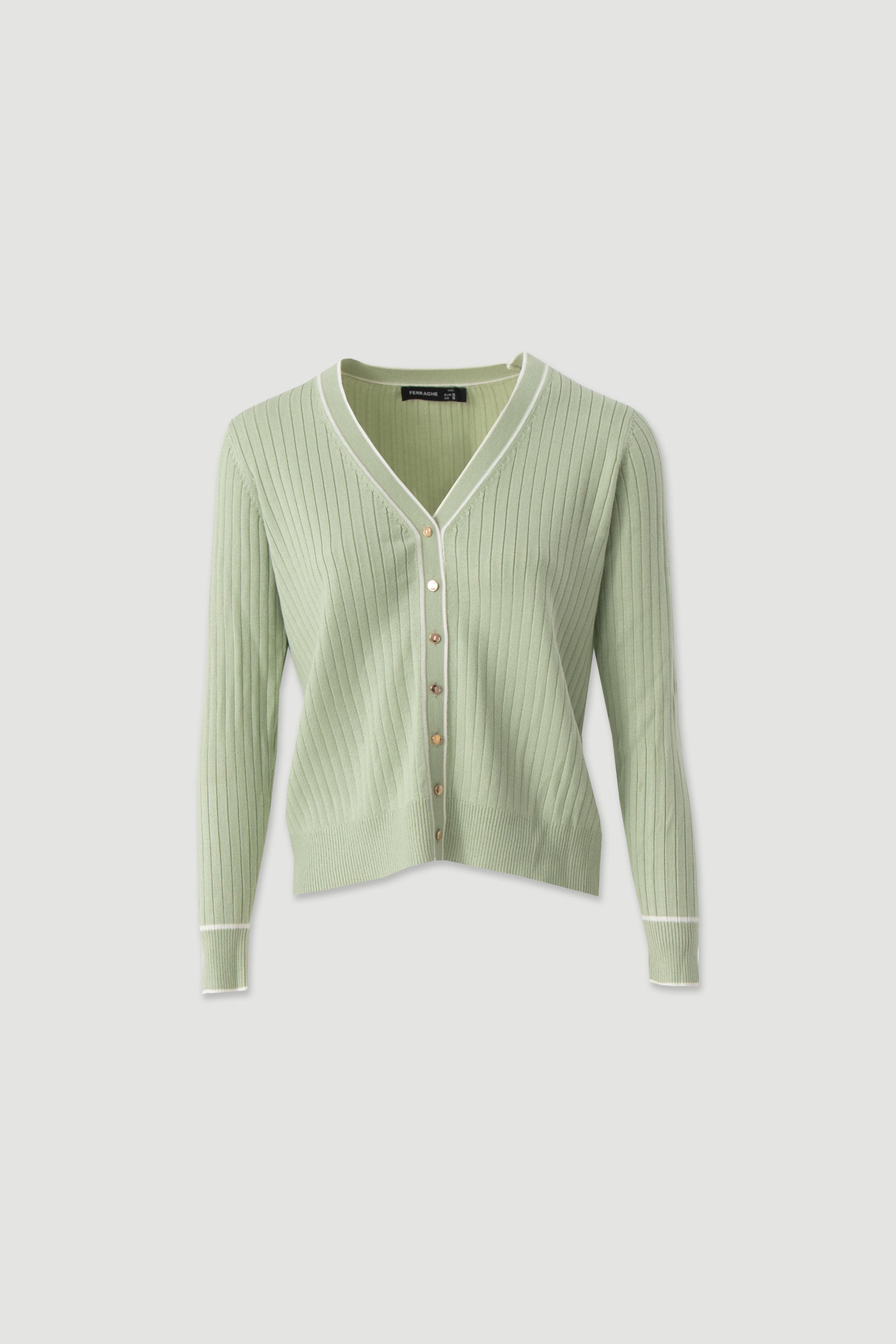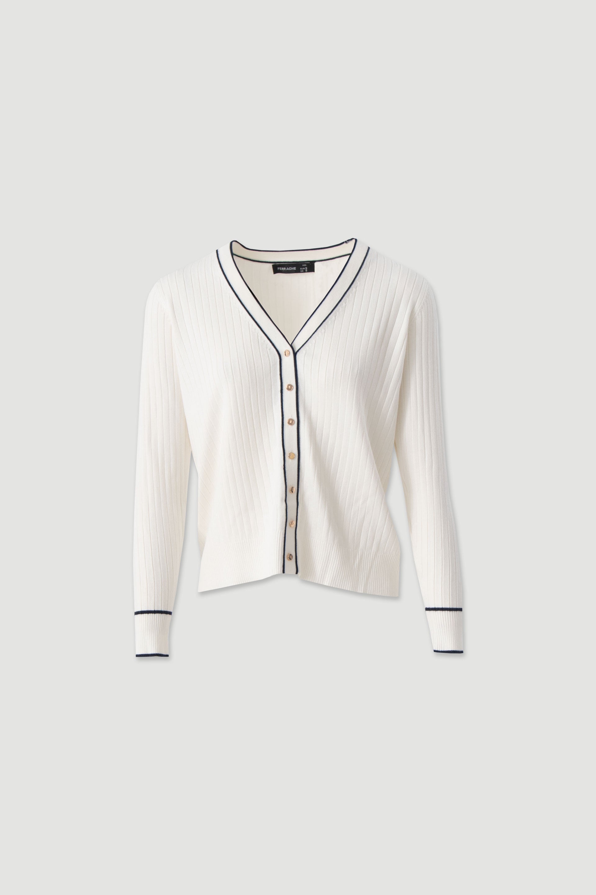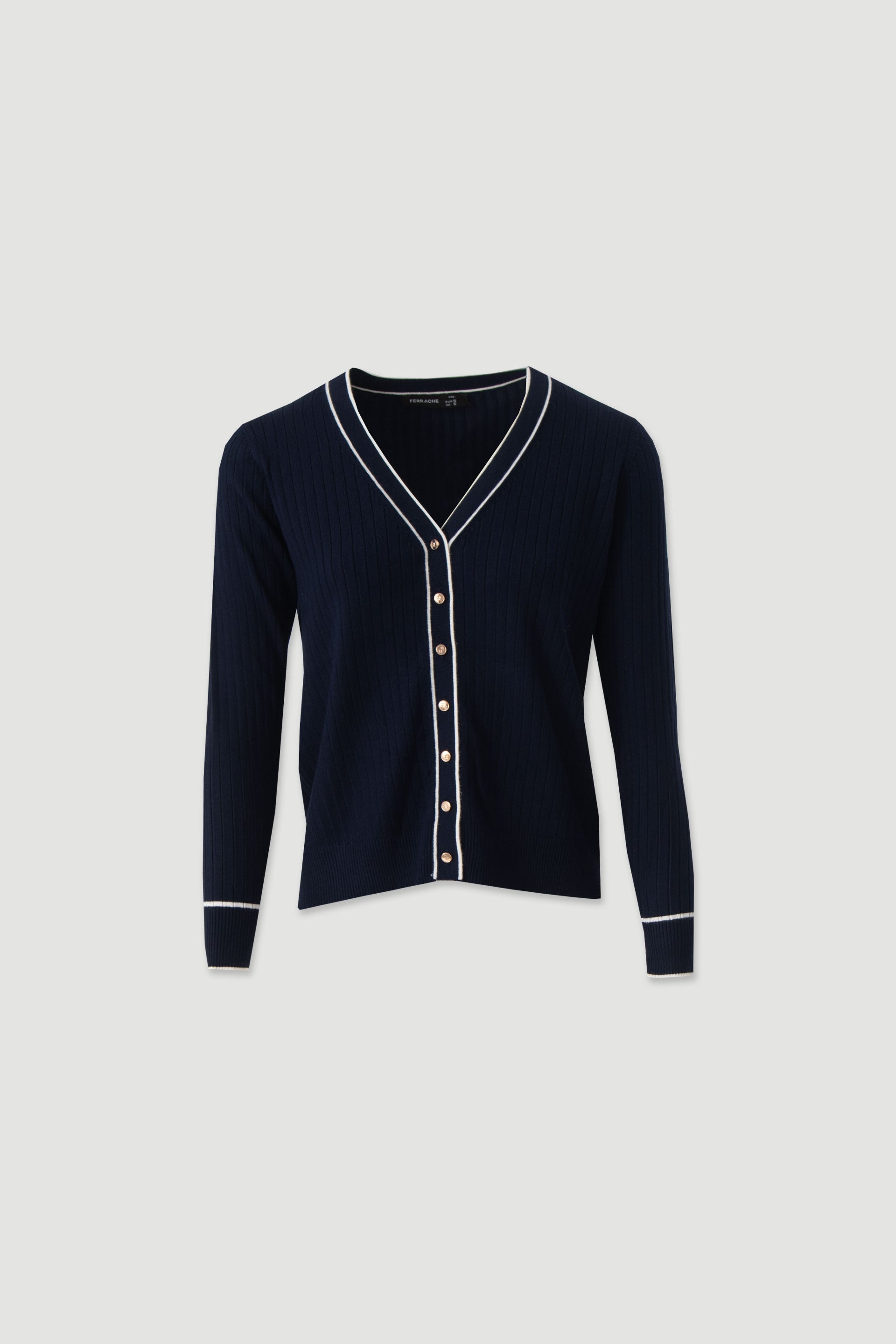 Casaco feminino Ferrache em malha canelada com decote em V e botões metálicos. Casaco feminino Ferrache em malha canelada com decote em V e botões metálicos.