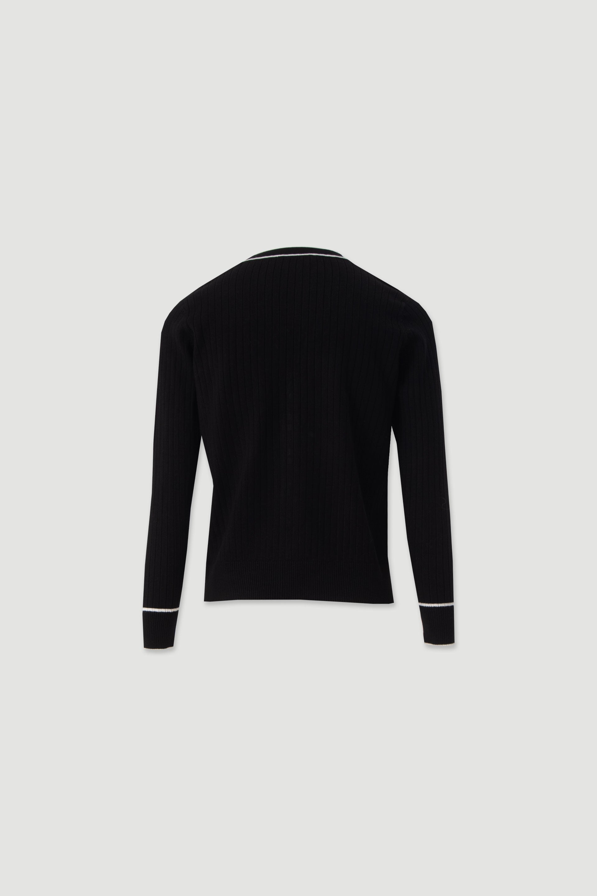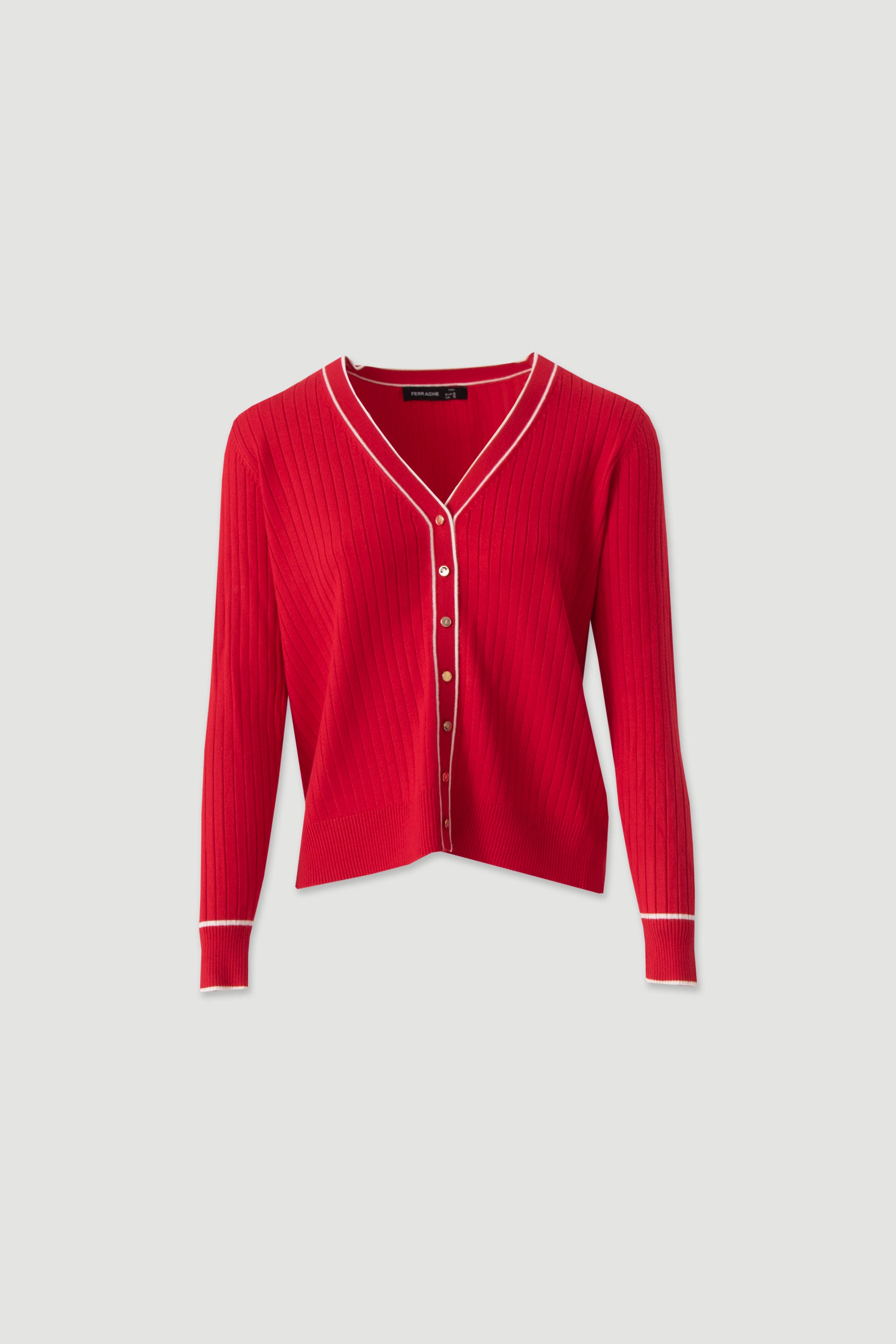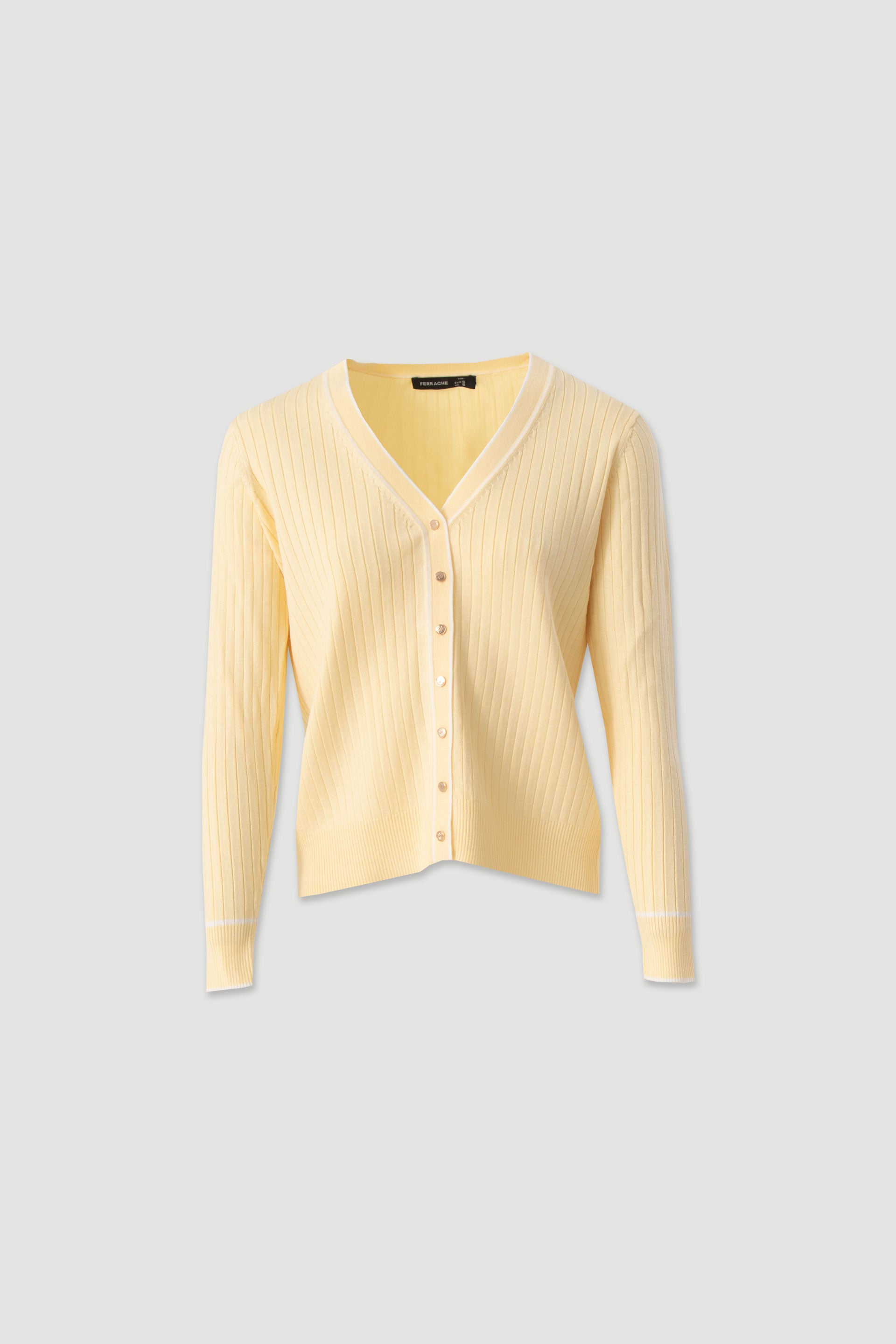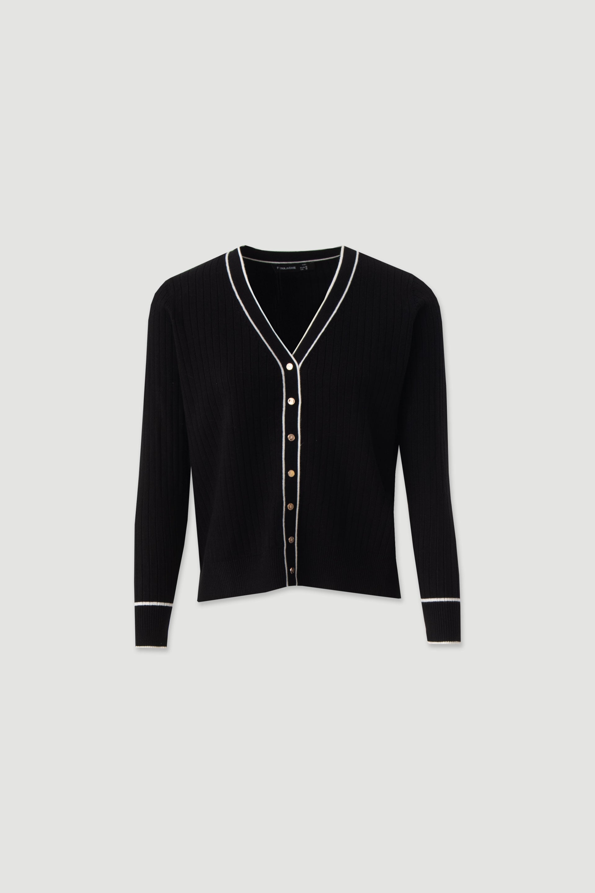 Casaco feminino Ferrache em malha canelada com decote em V e botões metálicos. Casaco feminino Ferrache em malha canelada com decote em V e botões metálicos.