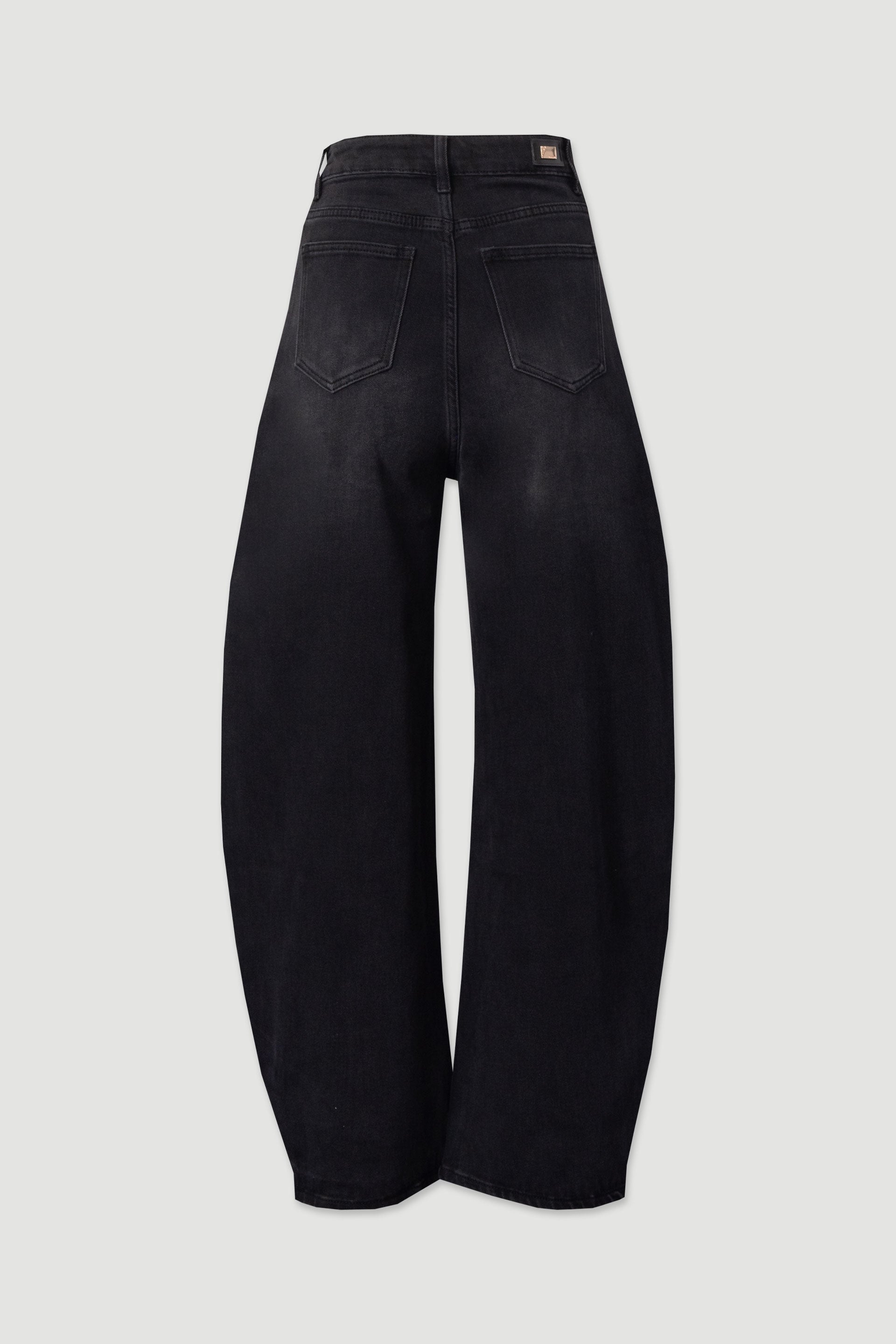 Calças de ganga preta da Ferrache estilo balloon em algodão, com cintura subida e um corte moderno que cria volume subtil na perna, garantindo um look atual e cheio de personalidade. Modelo de cinco bolsos, com presilhas para cinto e fecho frontal com fecho de correr e botão. Perfeitos para conjugar com tops justos, malhas ou camisas para um contraste elegante.