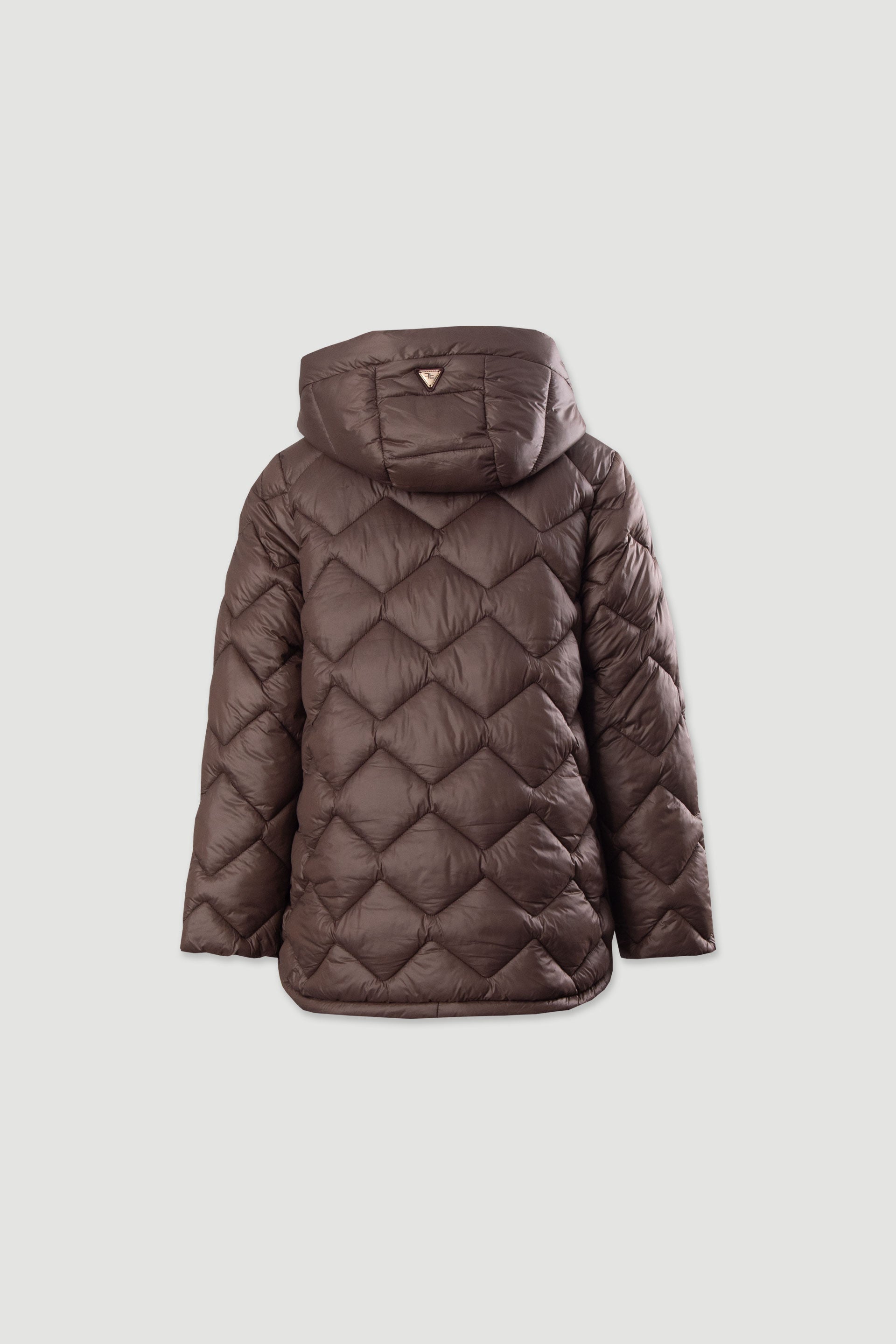 Parka acolchoada em tecido técnico com acabamento acetinado e padrão de pespontos em formato geométrico, que adiciona textura e estilo. O modelo apresenta capuz integrado, fecho frontal oculto com acabamentos personalizados e bolsos laterais com botões de pressão. Uma peça quente e confortável, perfeita para os dias frios, que combina praticidade e elegância moderna.