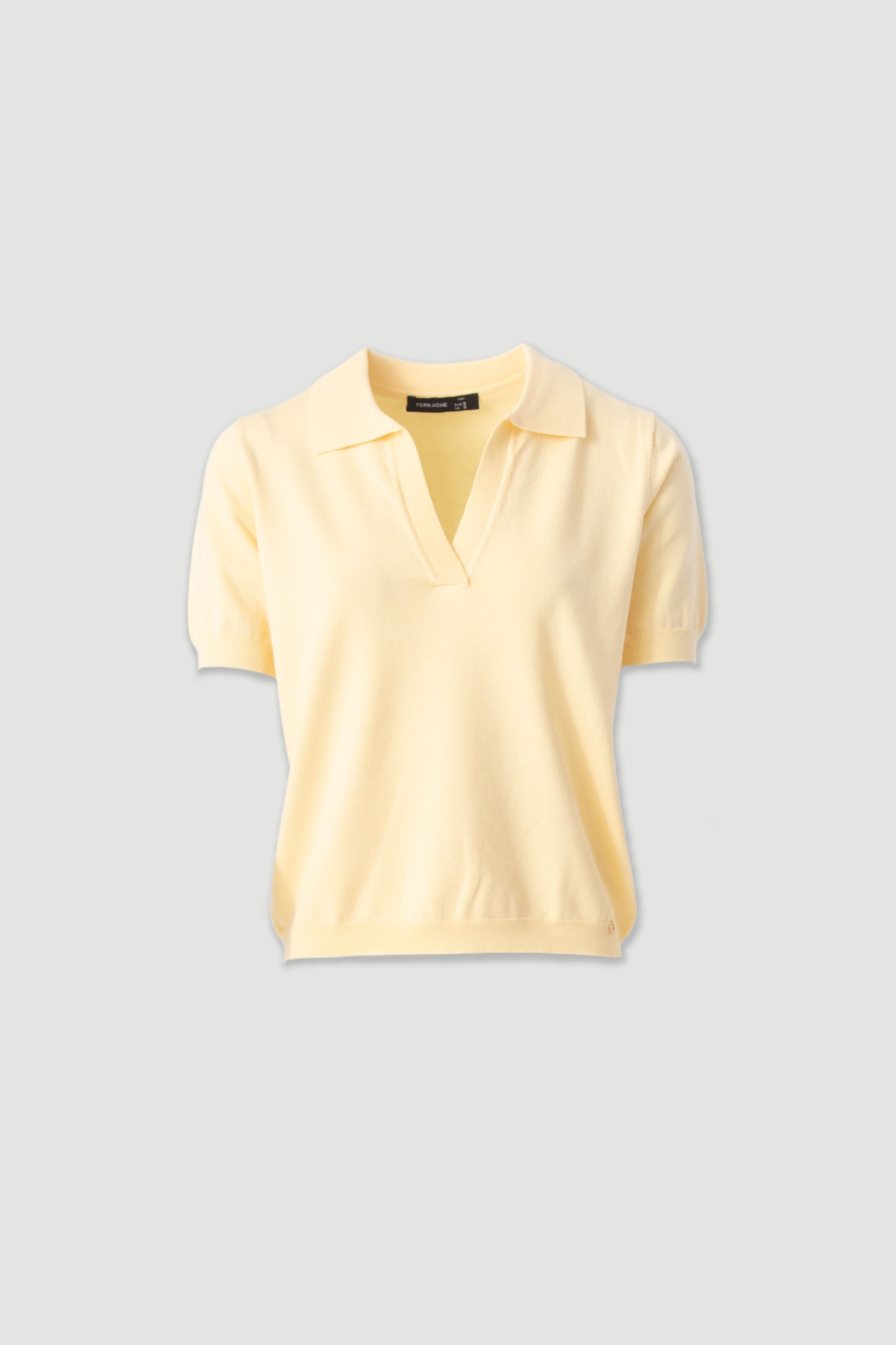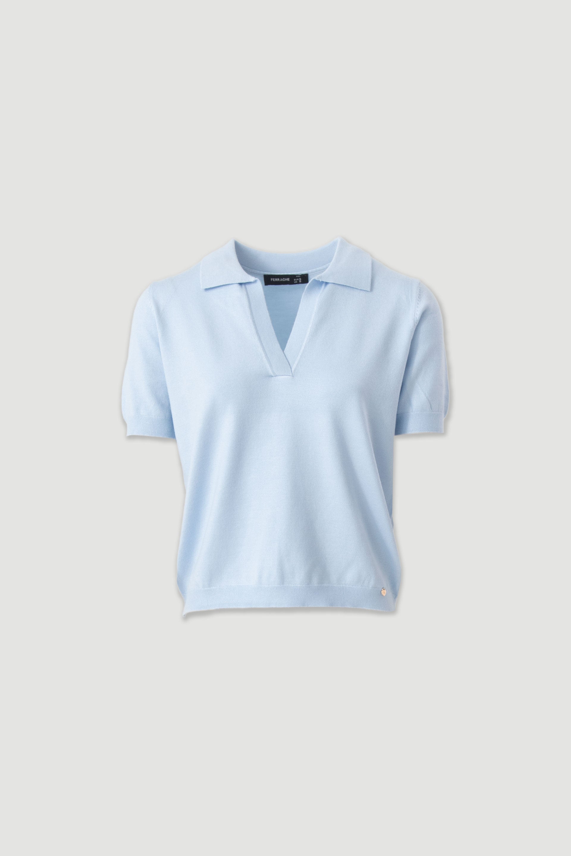 Polo da ferrache feminino em malha com gola clássica e decote em V. Modelo de manga curta com acabamento canelado na bainha e nas mangas, garantindo um ajuste confortável e elegante. Uma peça leve e versátil, ideal para looks frescos do dia a dia ou coordenados mais cuidados.