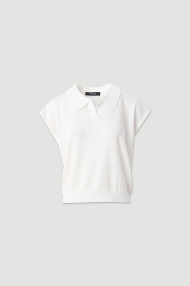 Polo feminino Ferrache em malha leve com decote em V, colarinho clássico e bainha canelada. Polo feminino Ferrache em malha leve com decote em V, colarinho clássico e bainha canelada.