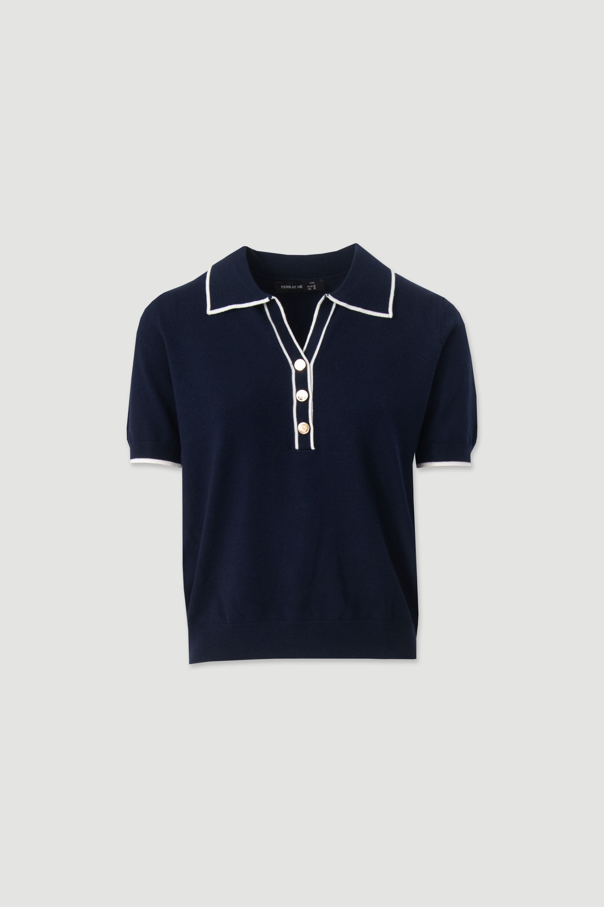 Apresenta gola clássica e carcela curta com botões dourados, que acrescentam um toque refinado ao design. Os vivos em contraste na gola e na carcela destacam a peça e criam um visual moderno e distinto.