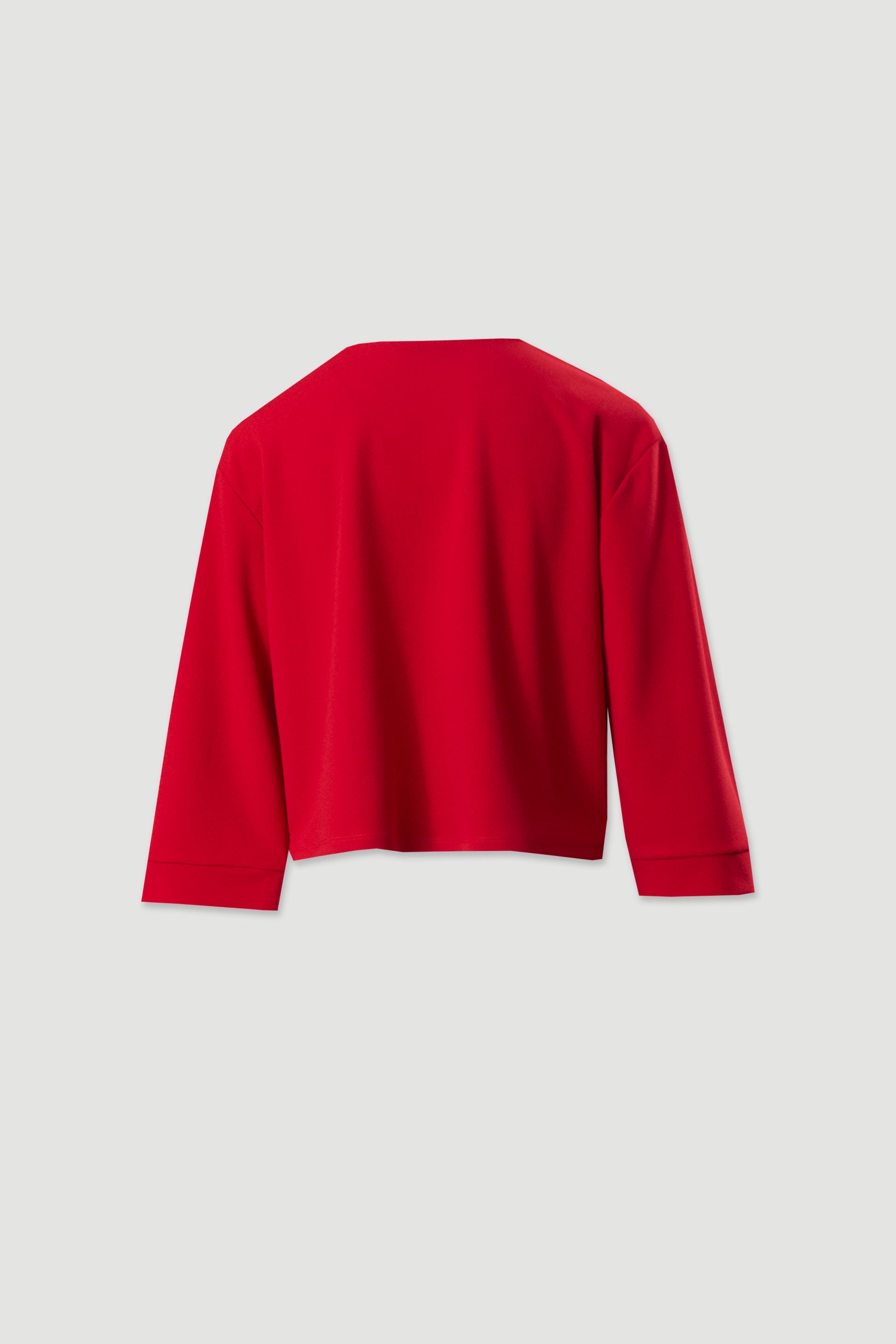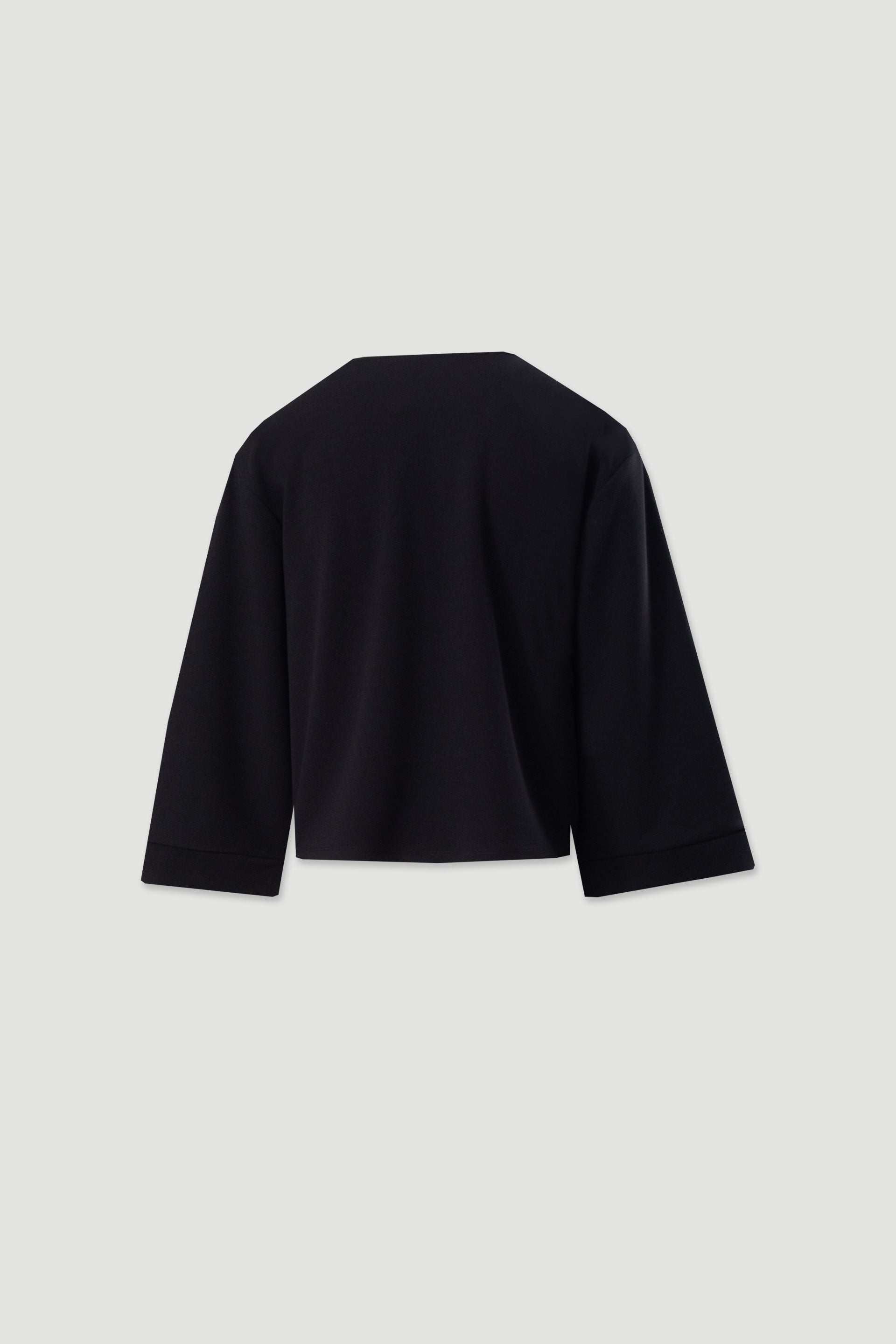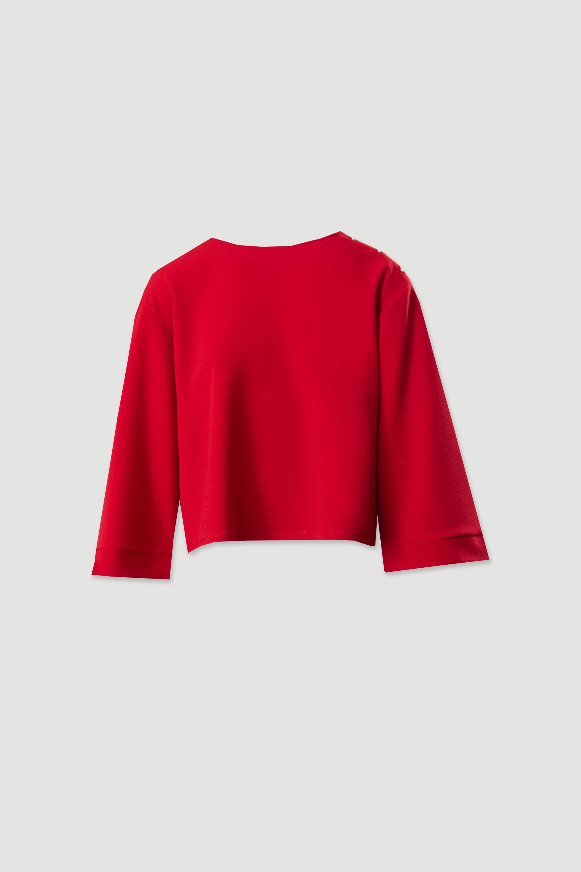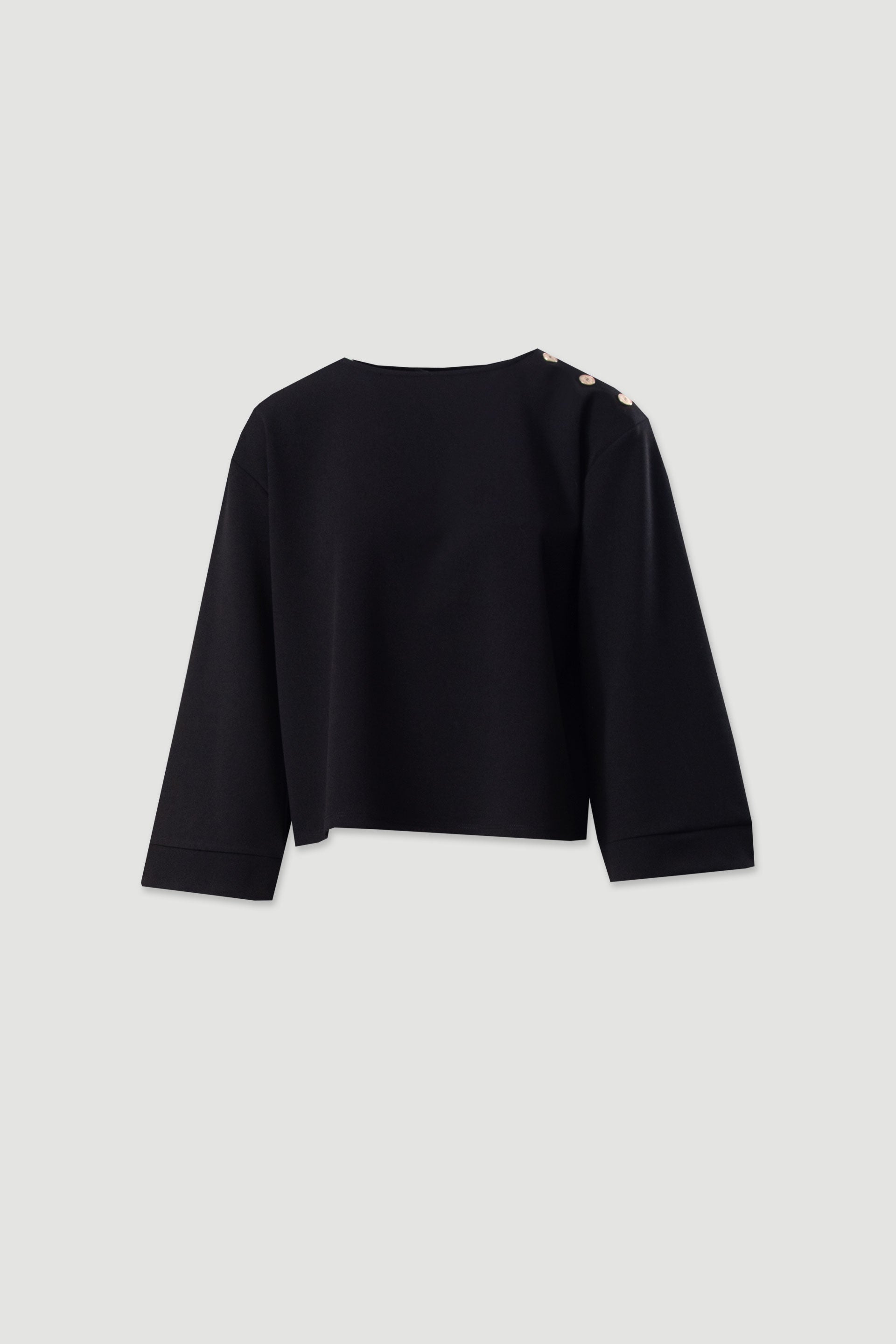 Canisola de corte reto e comprimento curto, com mangas 3/4 e punhos virados para um acabamento mais estruturado. O detalhe de botões decorativos no ombro acrescenta um toque moderno e elegante ao design minimalista. Uma peça versátil, ideal para coordenados descontraídos ou looks mais sofisticados.